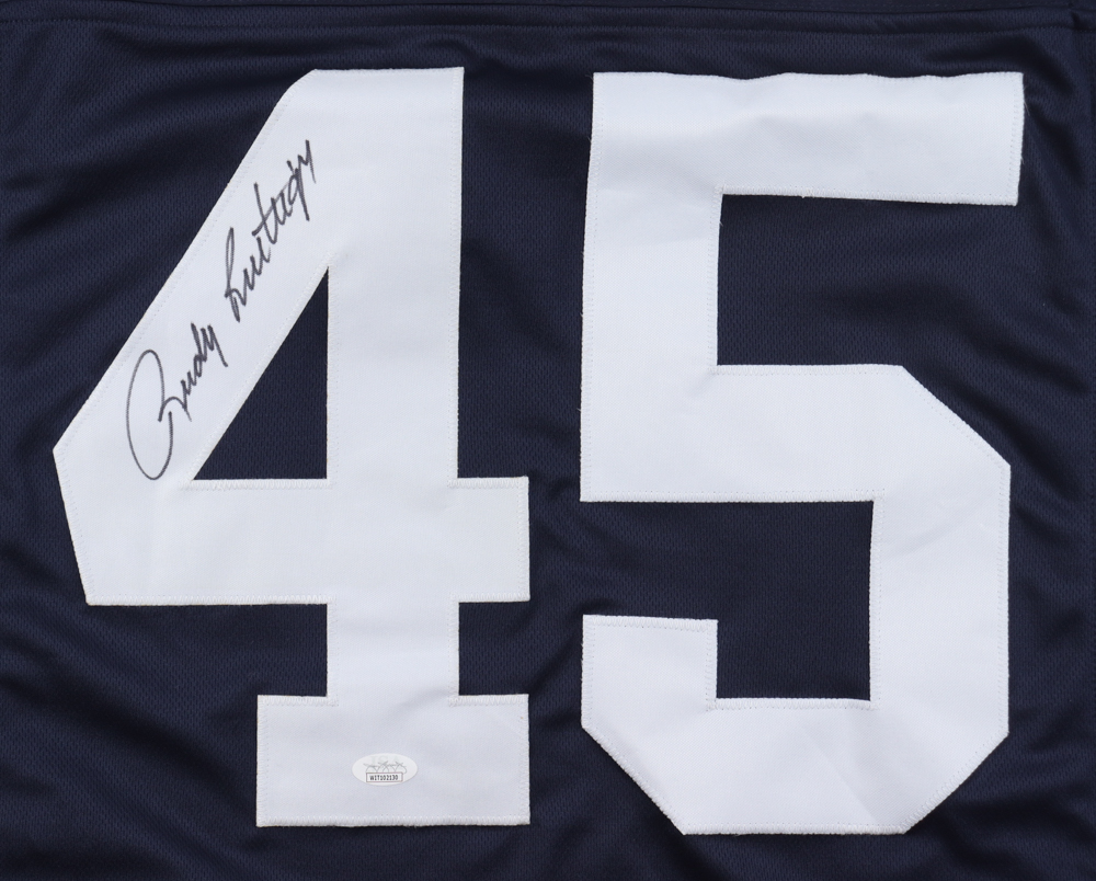 Custom jersey with everything sewn on, size XL. Hand-signed by Rudy Ruettiger.