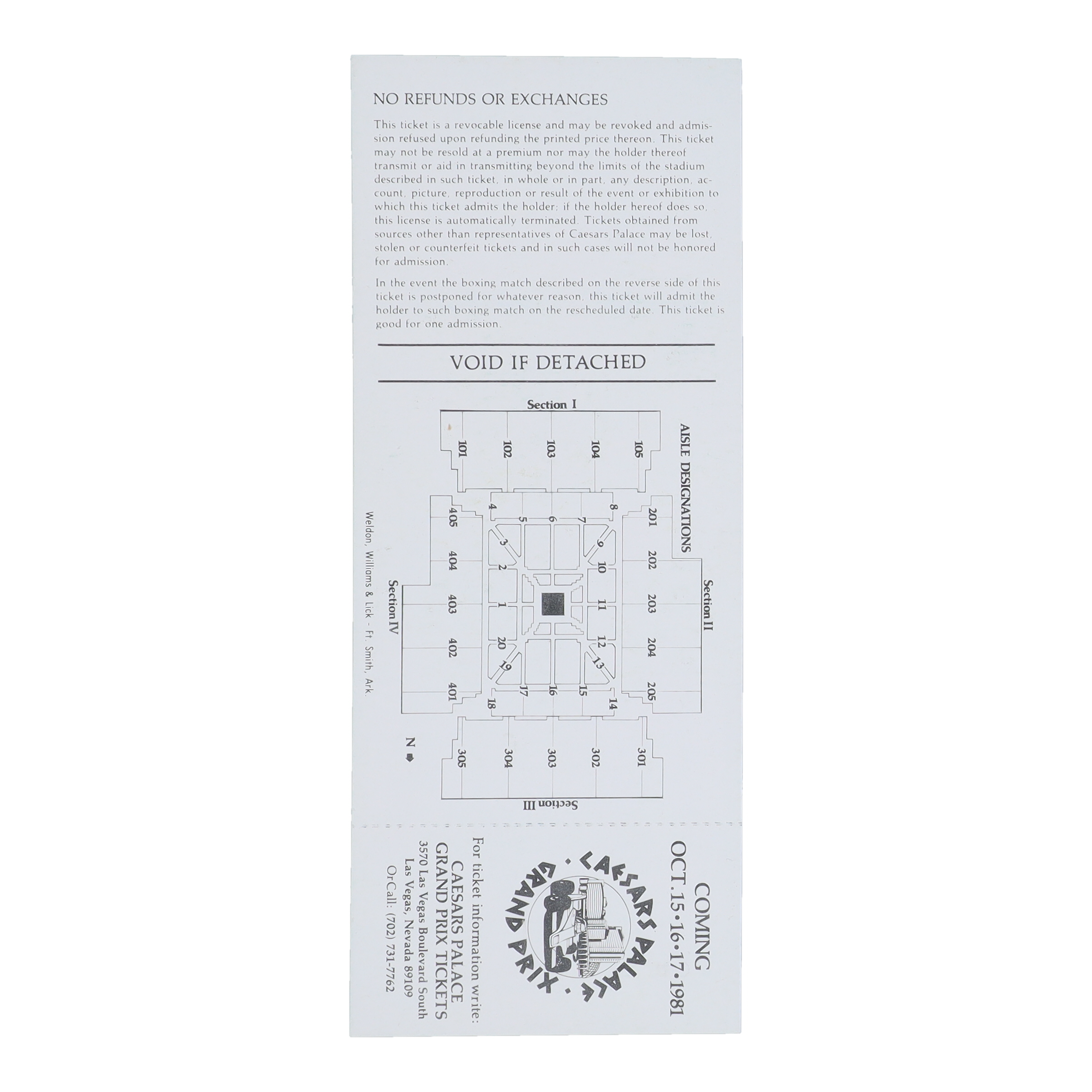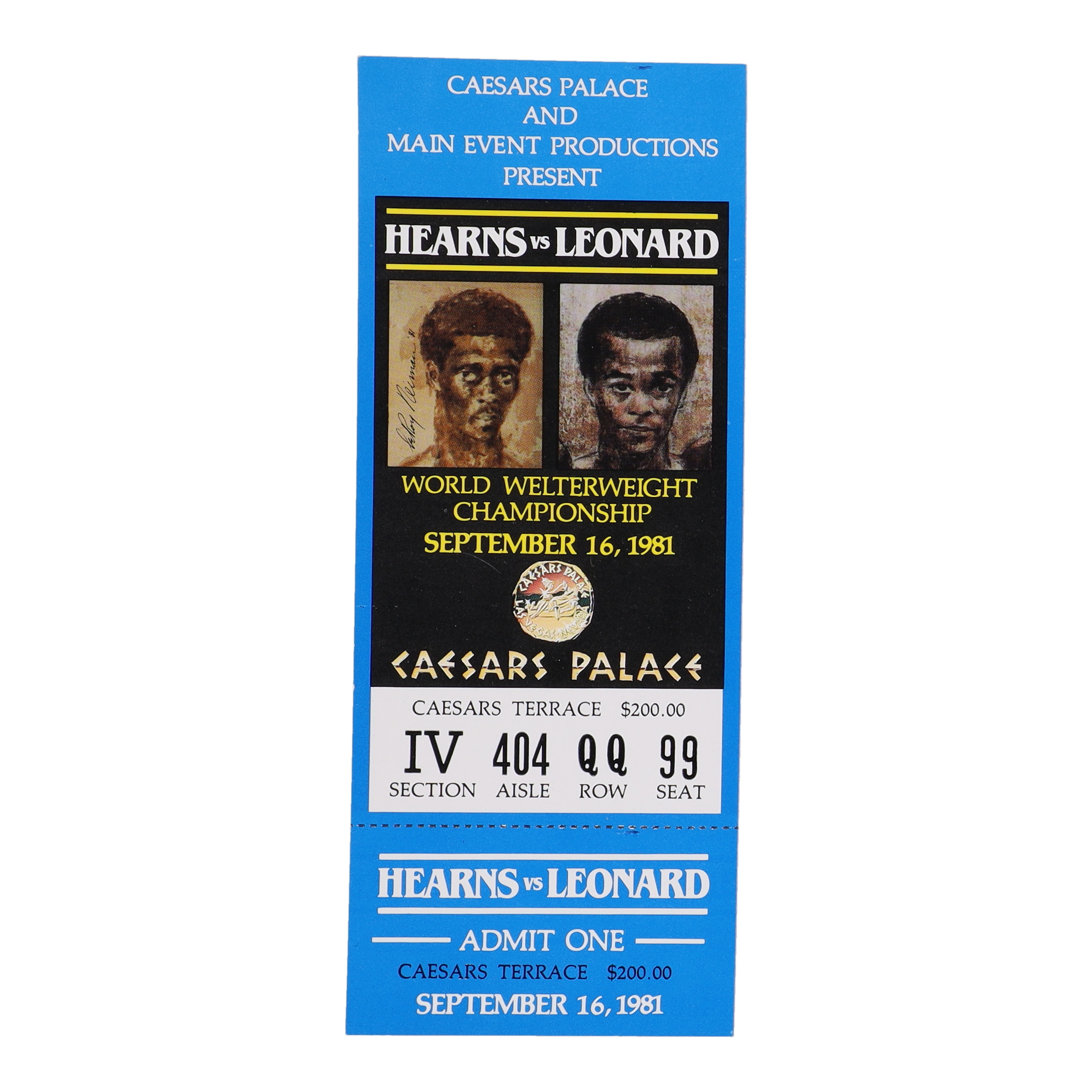 September 16t, 1981 Caesars Palace fight ticket. Please note, this item is unsigned.