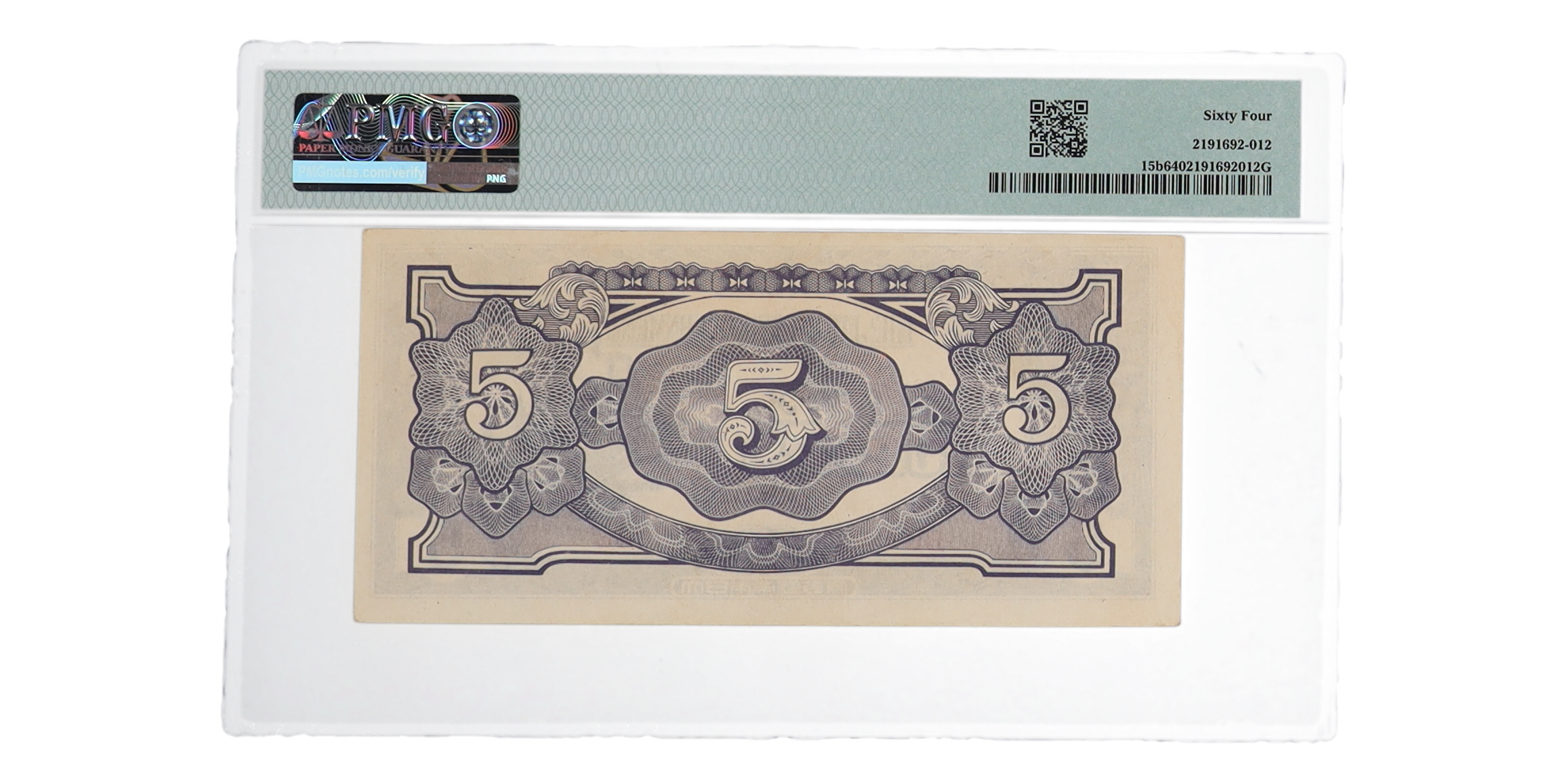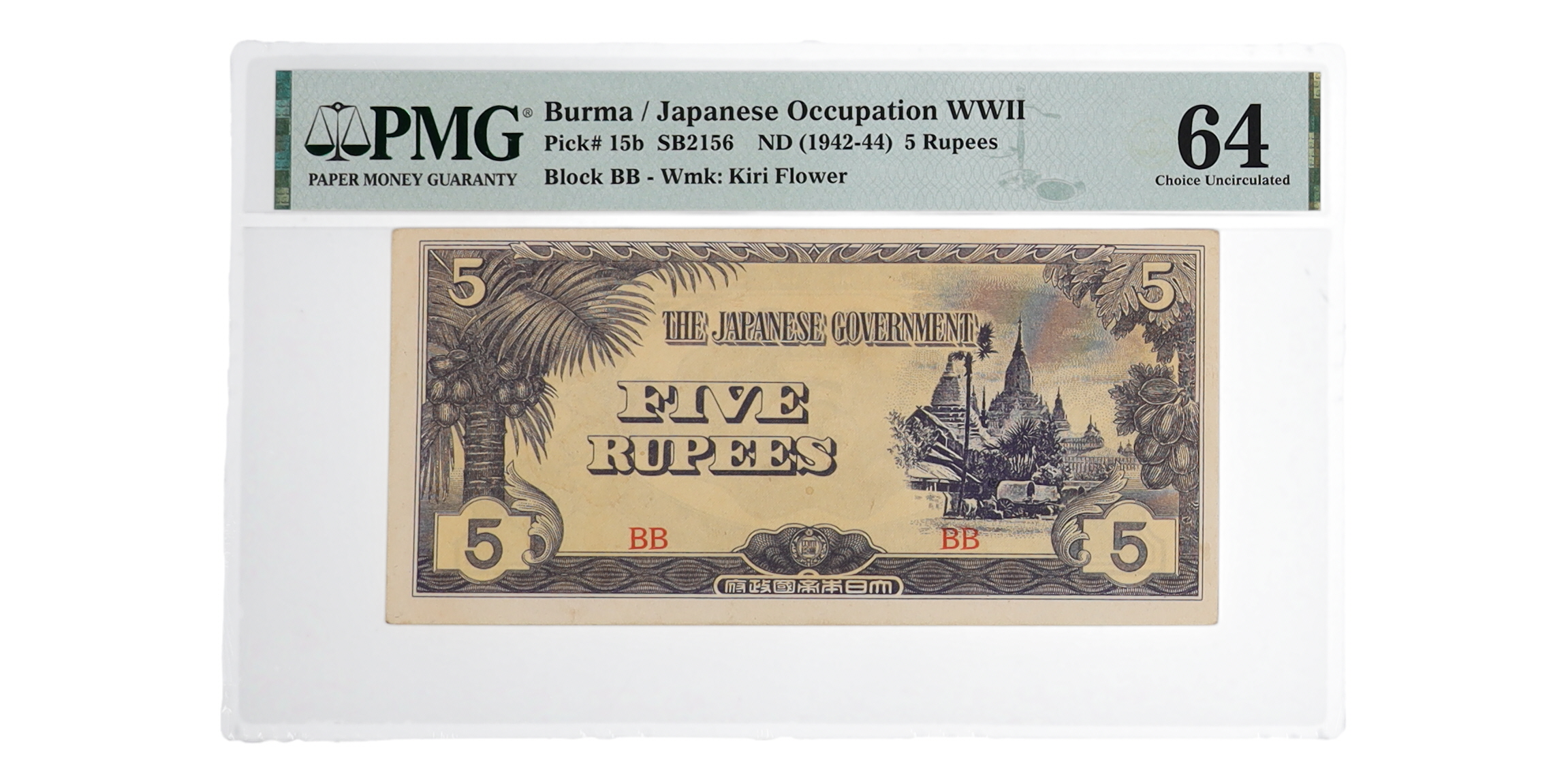 ND (1942-44) Burma / Japanese Occupation WWII - 5 Rupees Note (PMG Choice Unc 64)