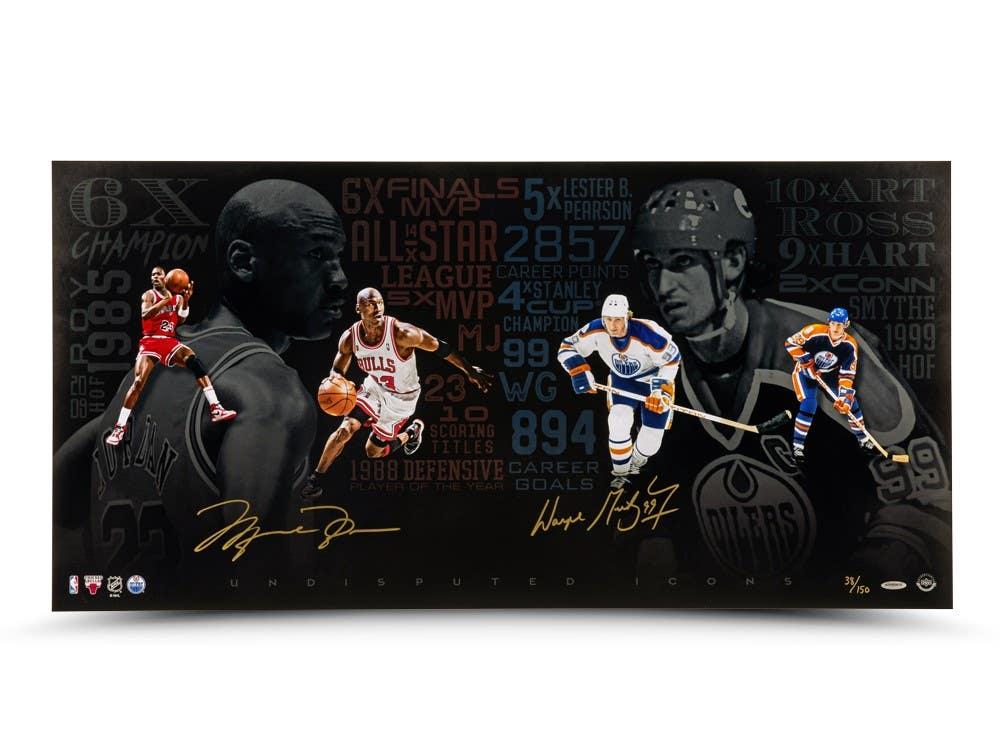 Photo measures 18” x 36” in size and has been hand-signed by Michael Jordan (Chicago Bulls, HOF) and Wayne Gretzky (Edmonton Oilers, HOF). This item is limited edition and has been numbered #/150.