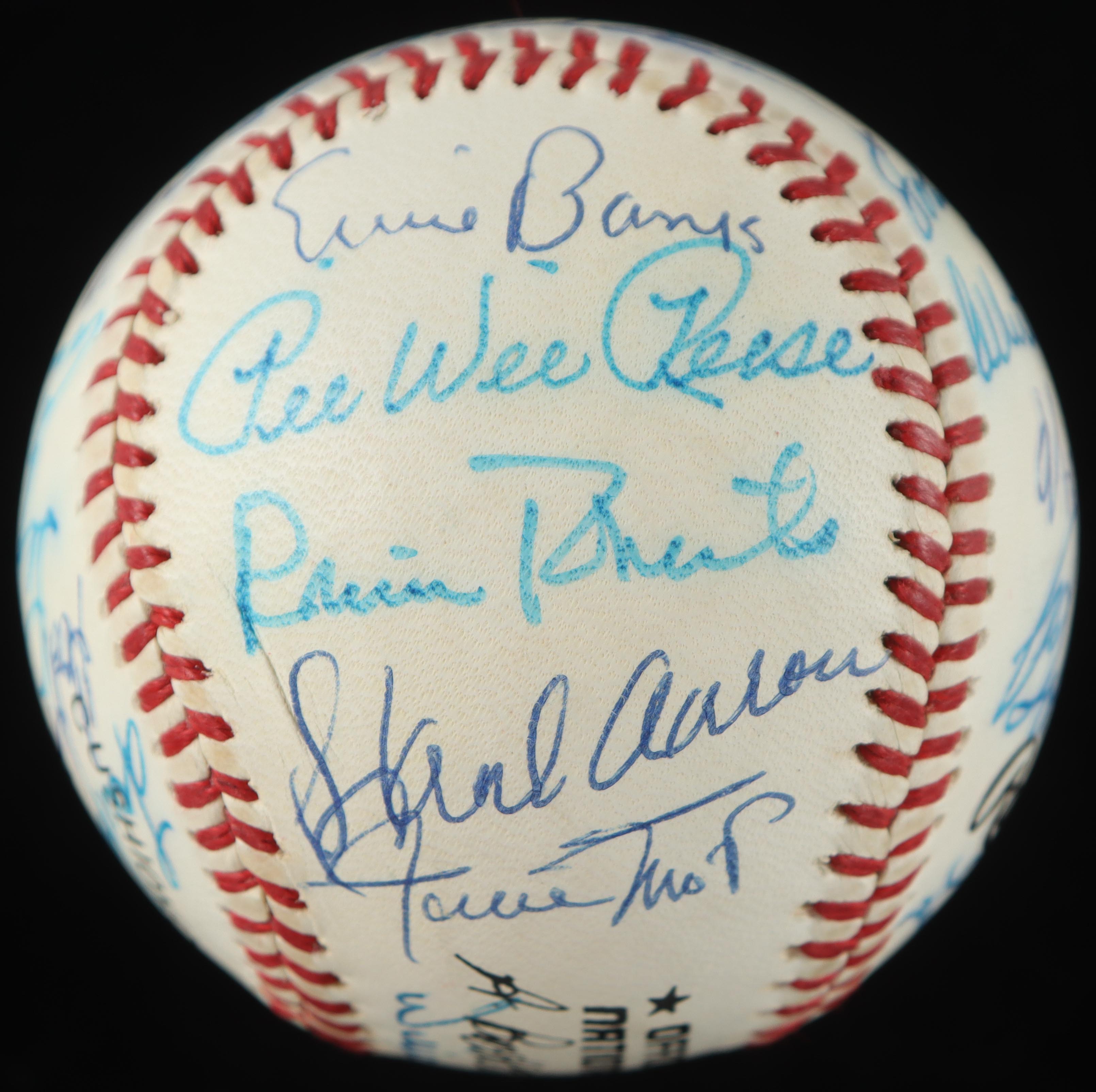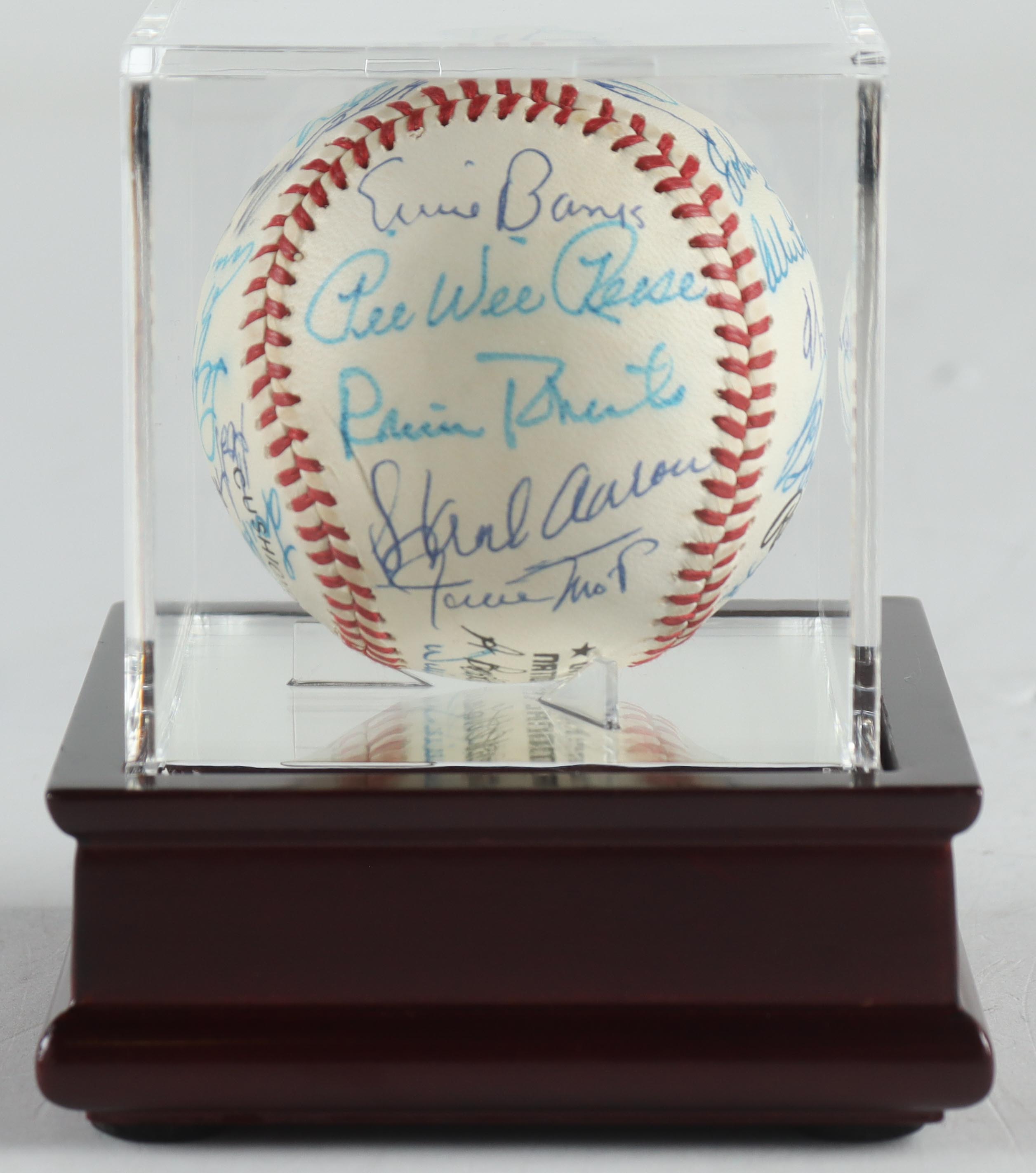 Hall of Famers ONL Baseball Signed by (26) with Hank Aaron, Willie Mays, Pee Wee Reese, Bob Gibson, Willie Stargell in Cherry Wood Display Case (PSA)