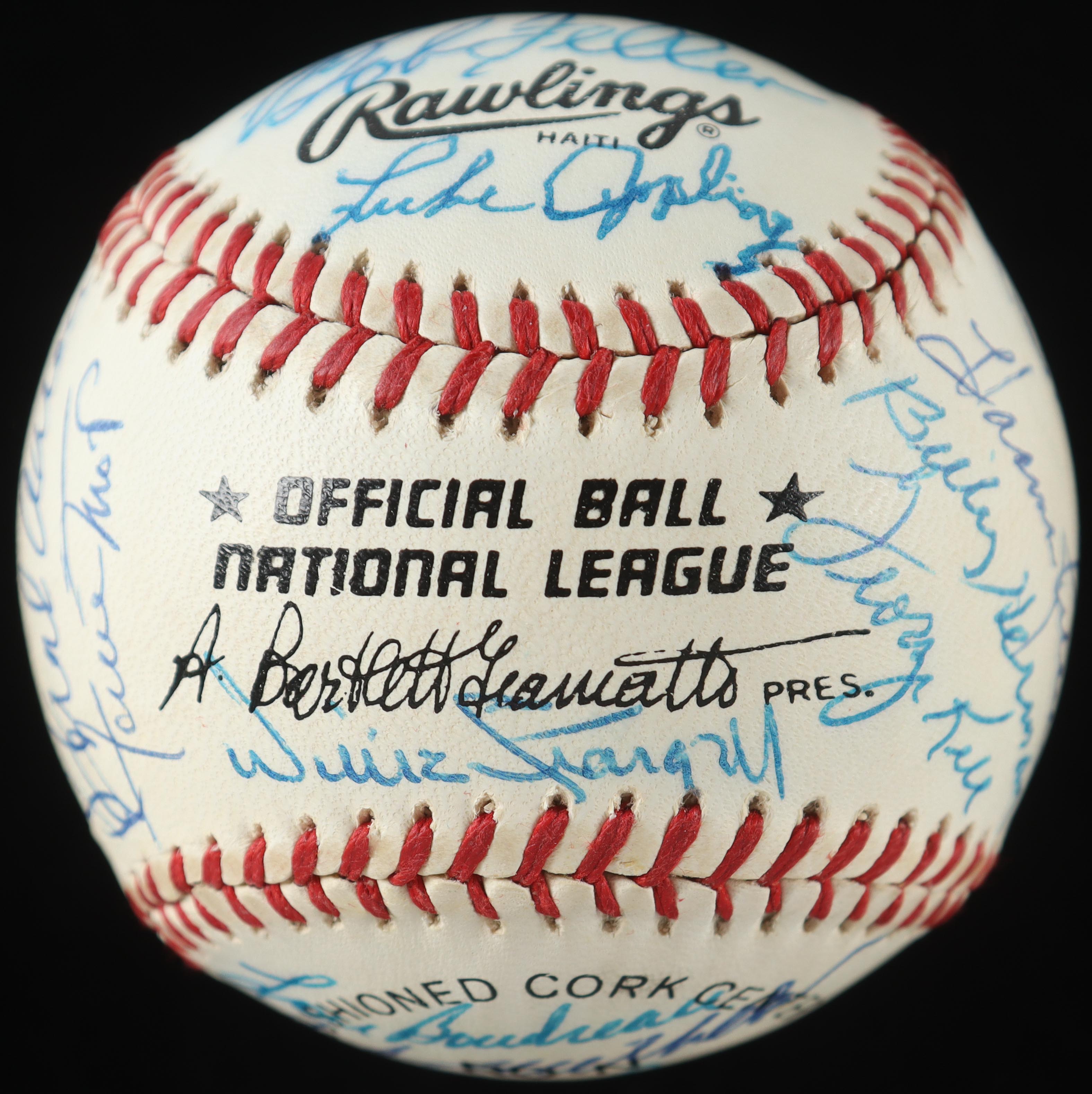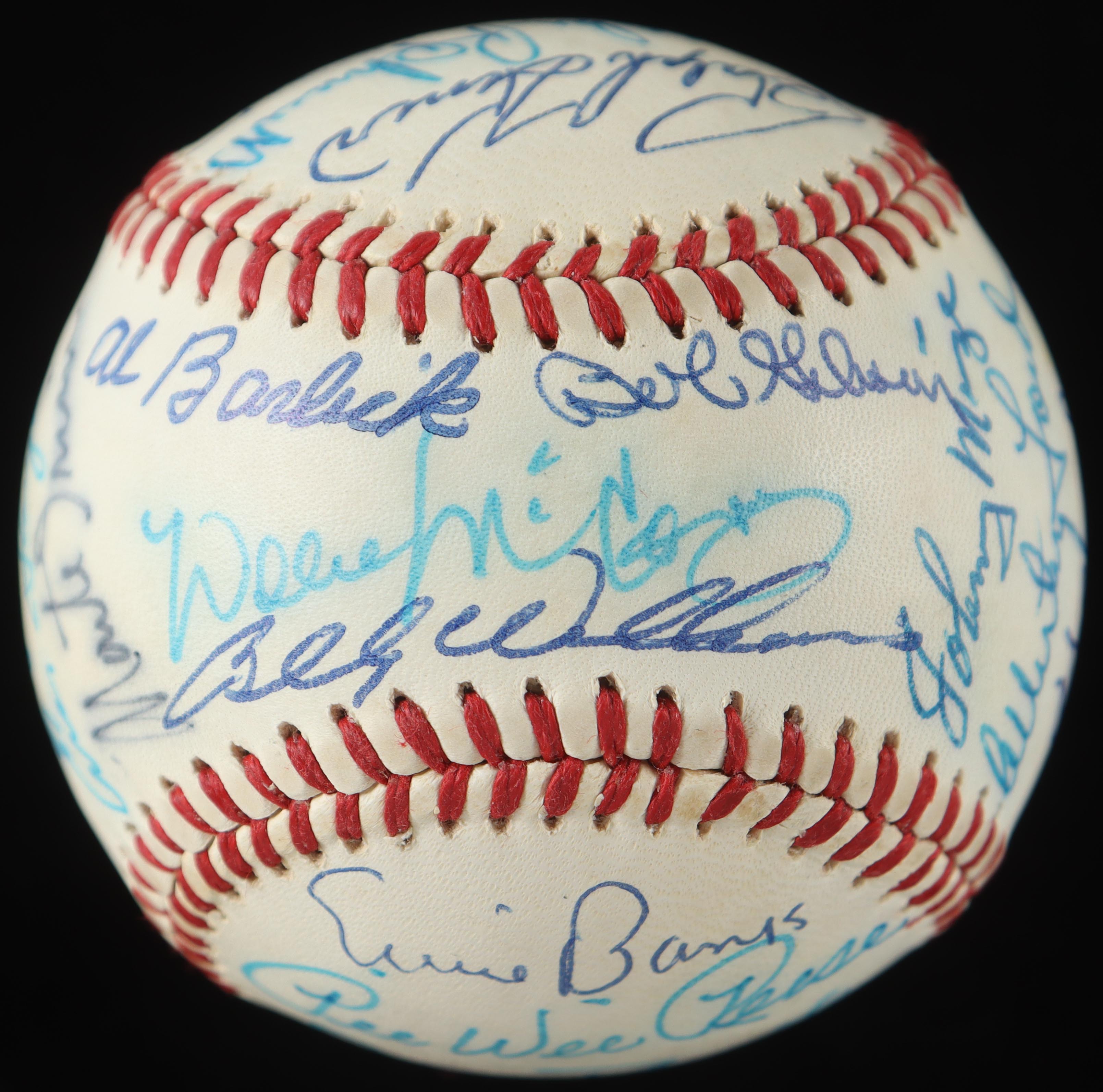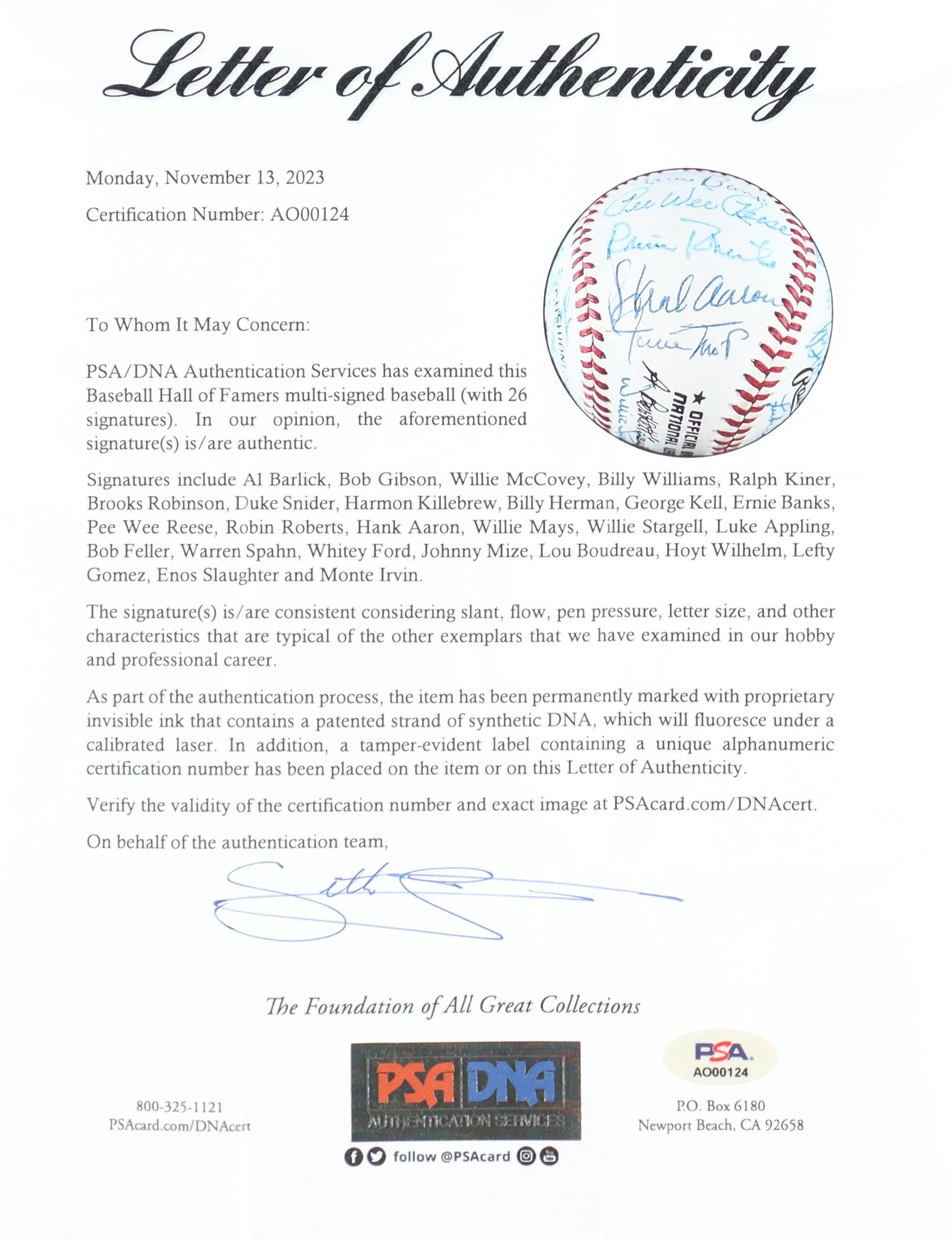 Rawlings Official National League baseball has been hand-signed by (26) with Hank Aaron, Willie Mays, Pee Wee Reese, Duke Snider, Luke Appling, Ernie Banks, Al Barlick, Whitey Ford, Bob Gibson, Lefty Gomez, Billy Herman, Harmon Killebrew, Johnny Mize, Enos Slaughter, Warren Spahn, Willie Stargell, Hoyt Wilhelm, Lou Boudreau, Bob Feller, Monte Irvin, George Kell, Ralph Kiner, Willie Mccovey, Robin Roberts, Brooks Robinson, and Billy Williams. Includes display case as shown. Please note, the baseball is naturally toned and some signatures are faded.