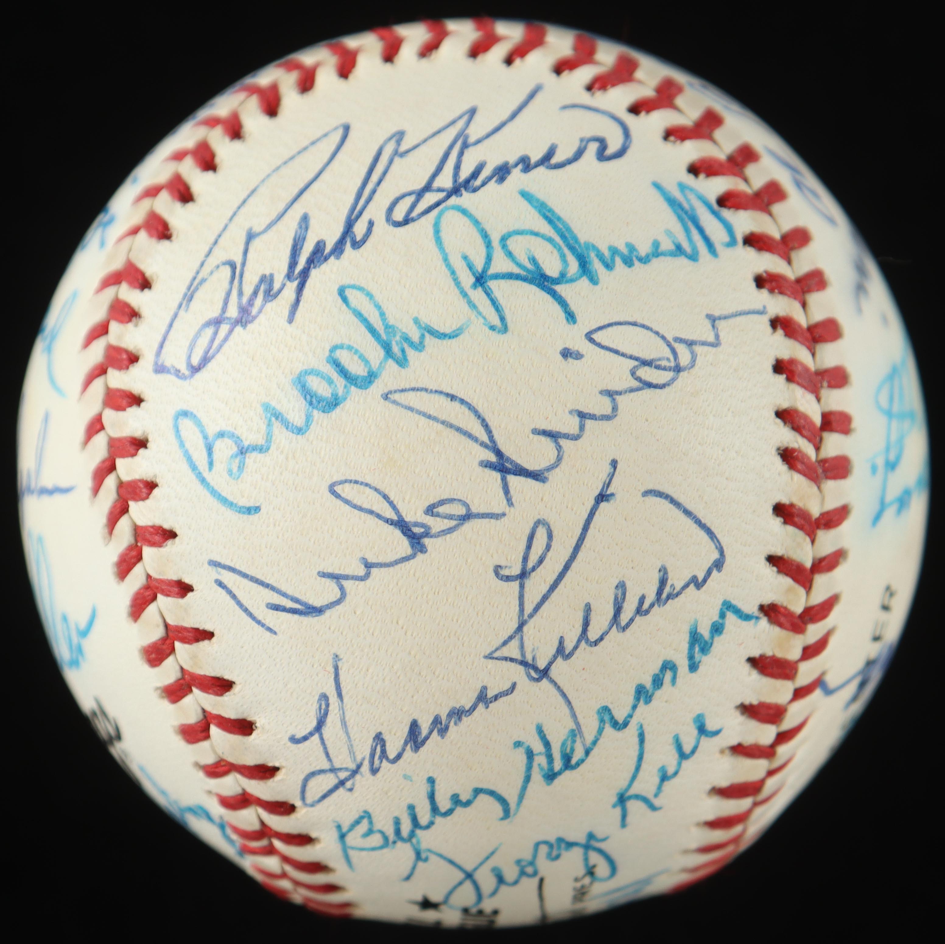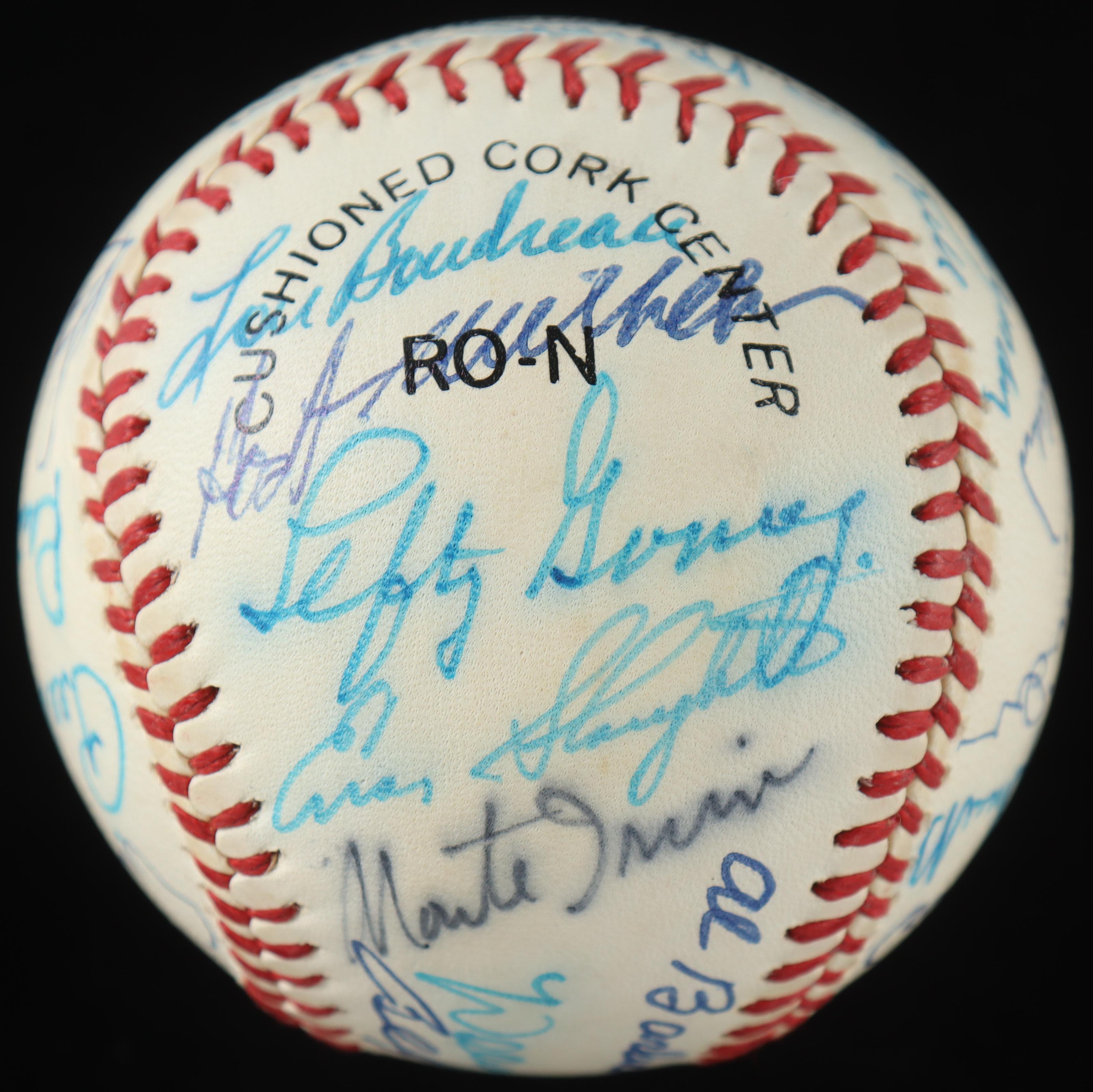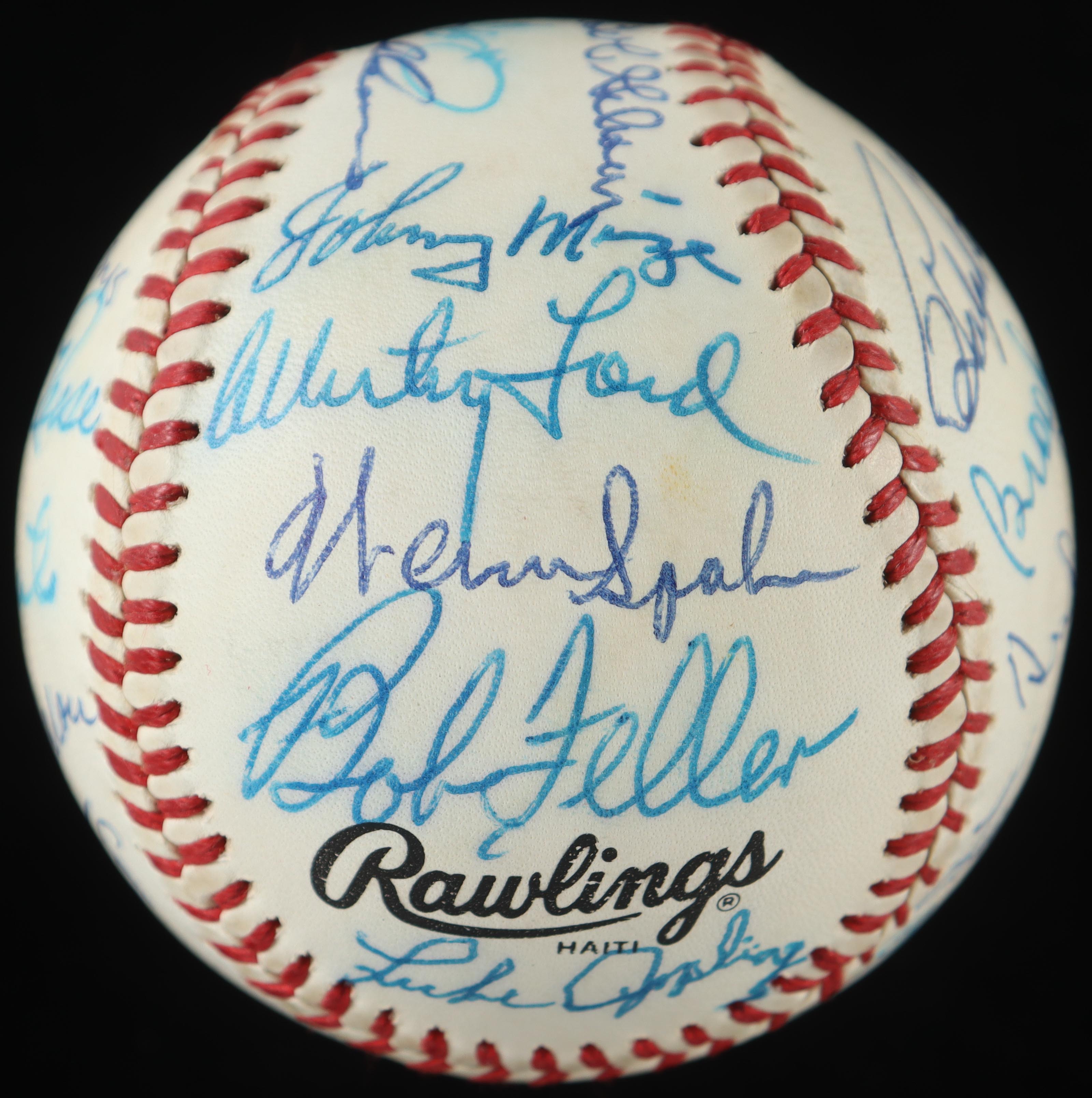 Rawlings Official National League baseball has been hand-signed by (26) with Hank Aaron, Willie Mays, Pee Wee Reese, Duke Snider, Luke Appling, Ernie Banks, Al Barlick, Whitey Ford, Bob Gibson, Lefty Gomez, Billy Herman, Harmon Killebrew, Johnny Mize, Enos Slaughter, Warren Spahn, Willie Stargell, Hoyt Wilhelm, Lou Boudreau, Bob Feller, Monte Irvin, George Kell, Ralph Kiner, Willie Mccovey, Robin Roberts, Brooks Robinson, and Billy Williams. Includes display case as shown. Please note, the baseball is naturally toned and some signatures are faded.