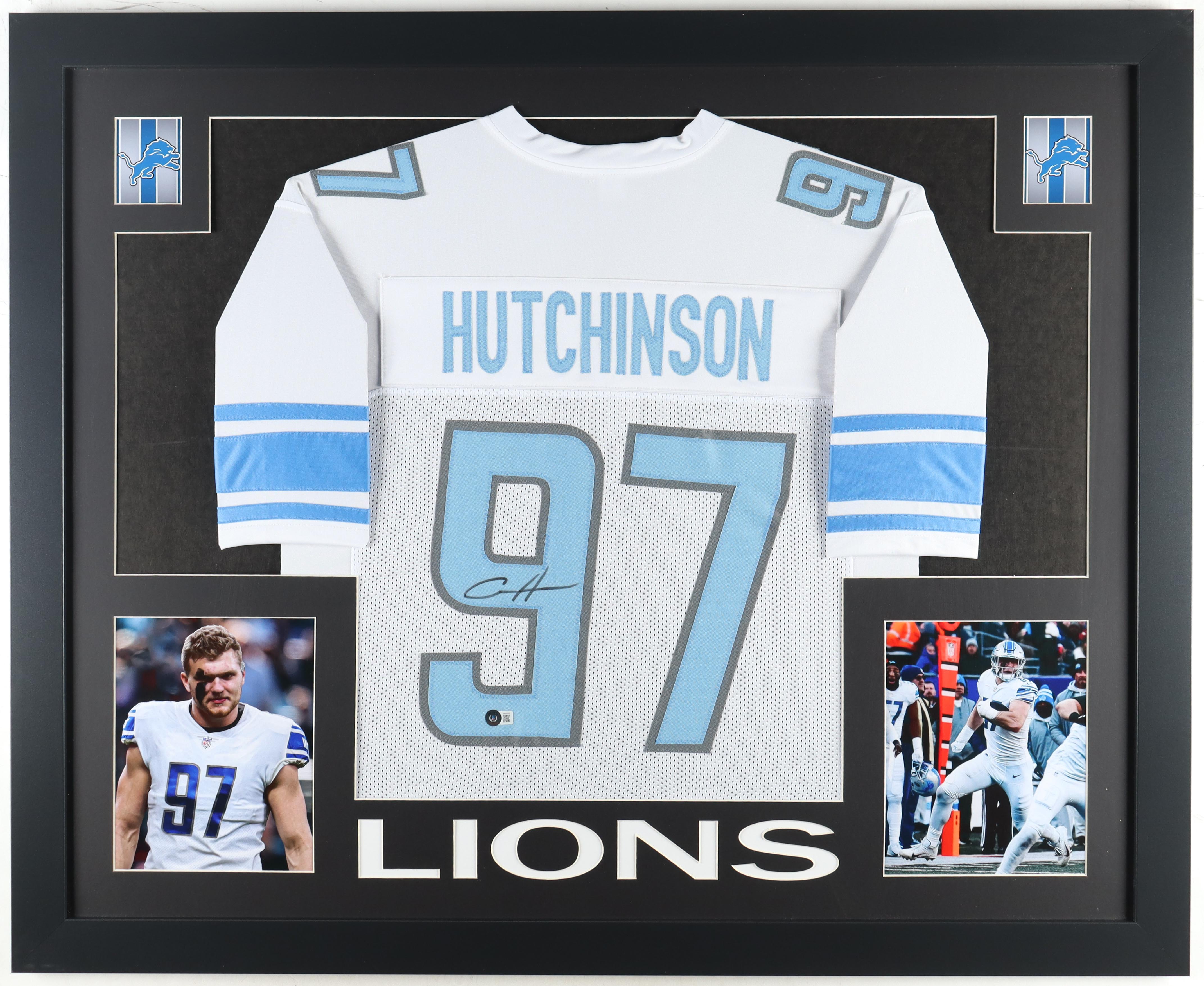 Custom frame measures approximately 35" x 43" in size and features a jersey hand-signed by Aidan Hutchinson. Please note, the frame is chipped. See photos for more details.