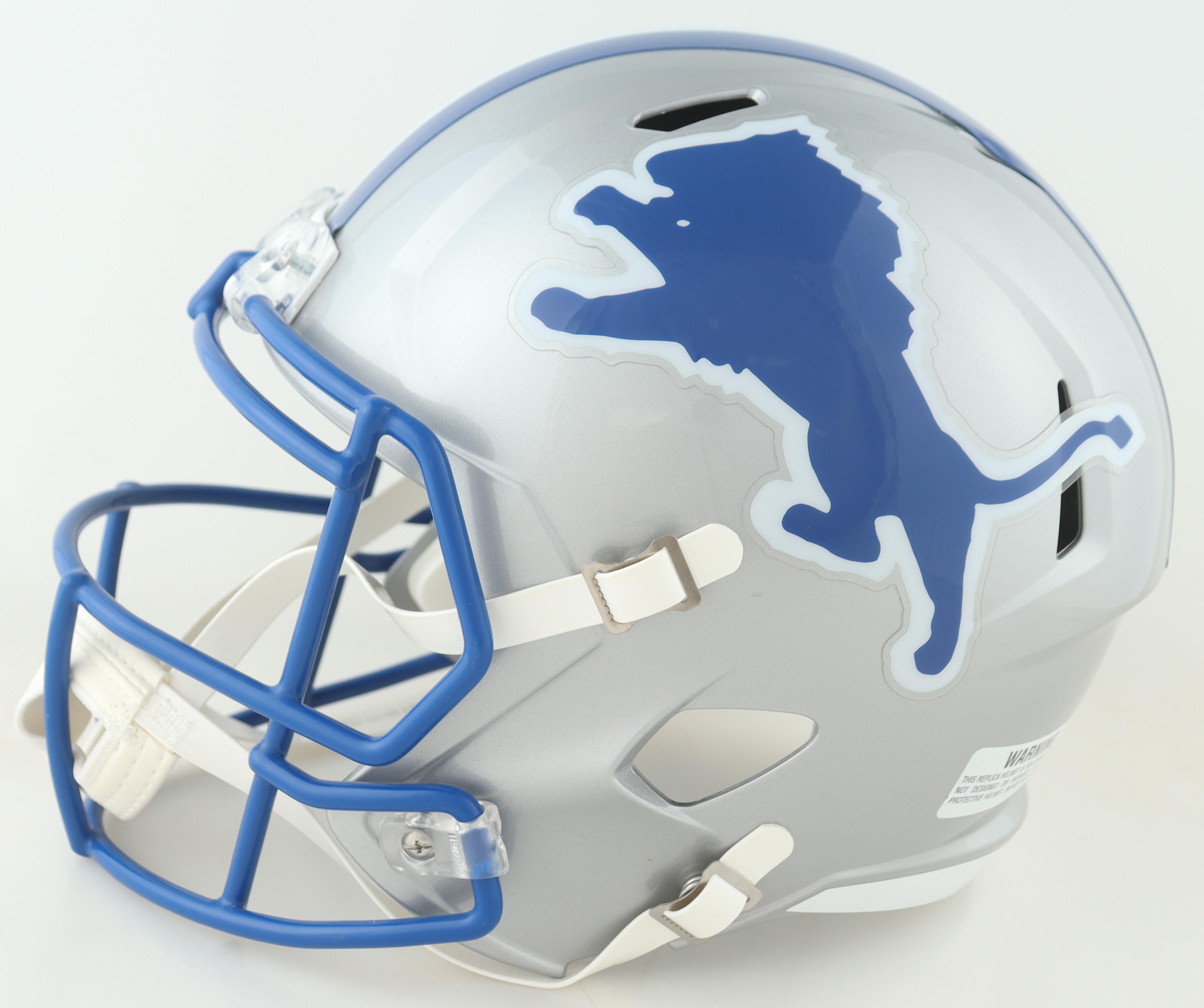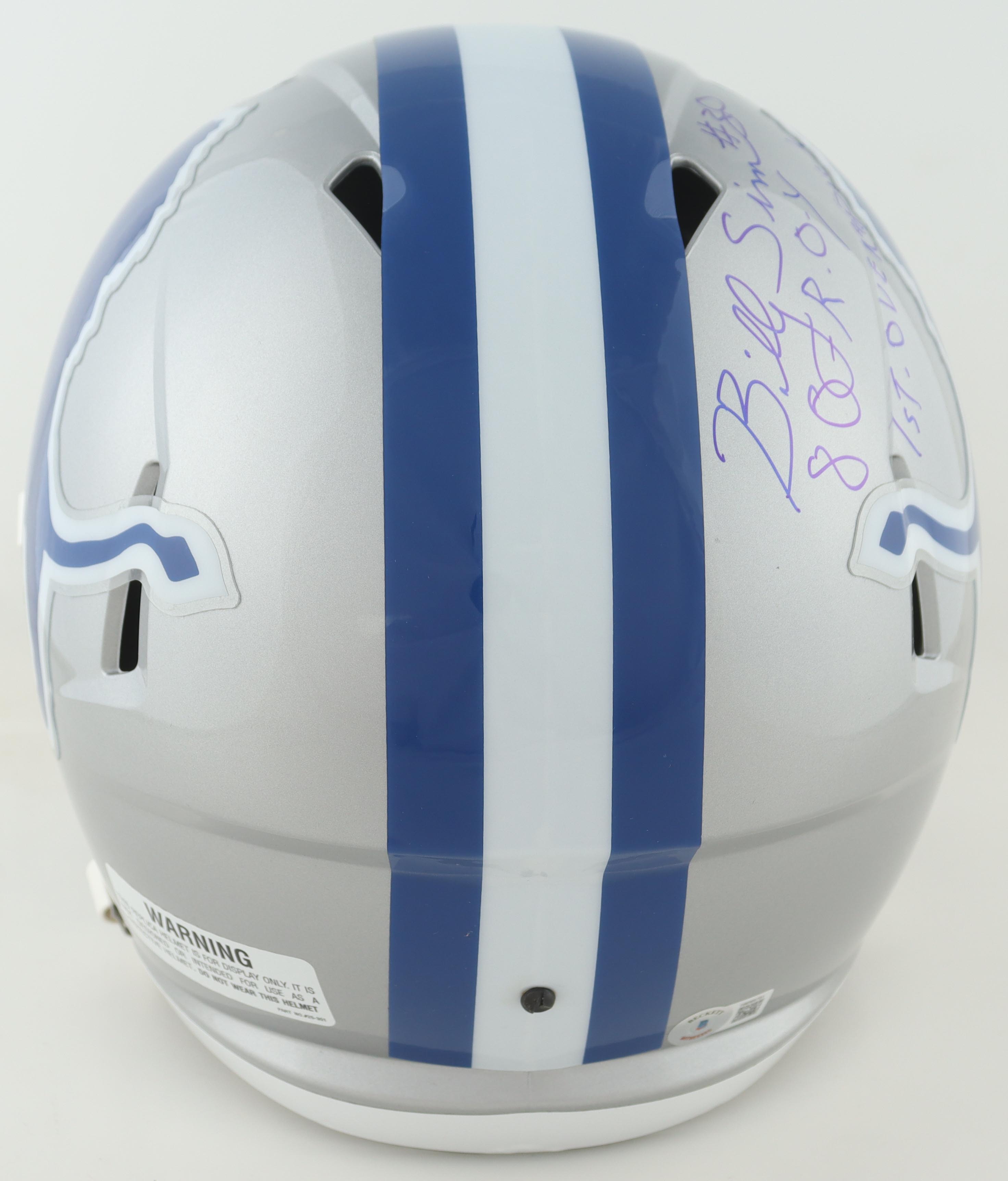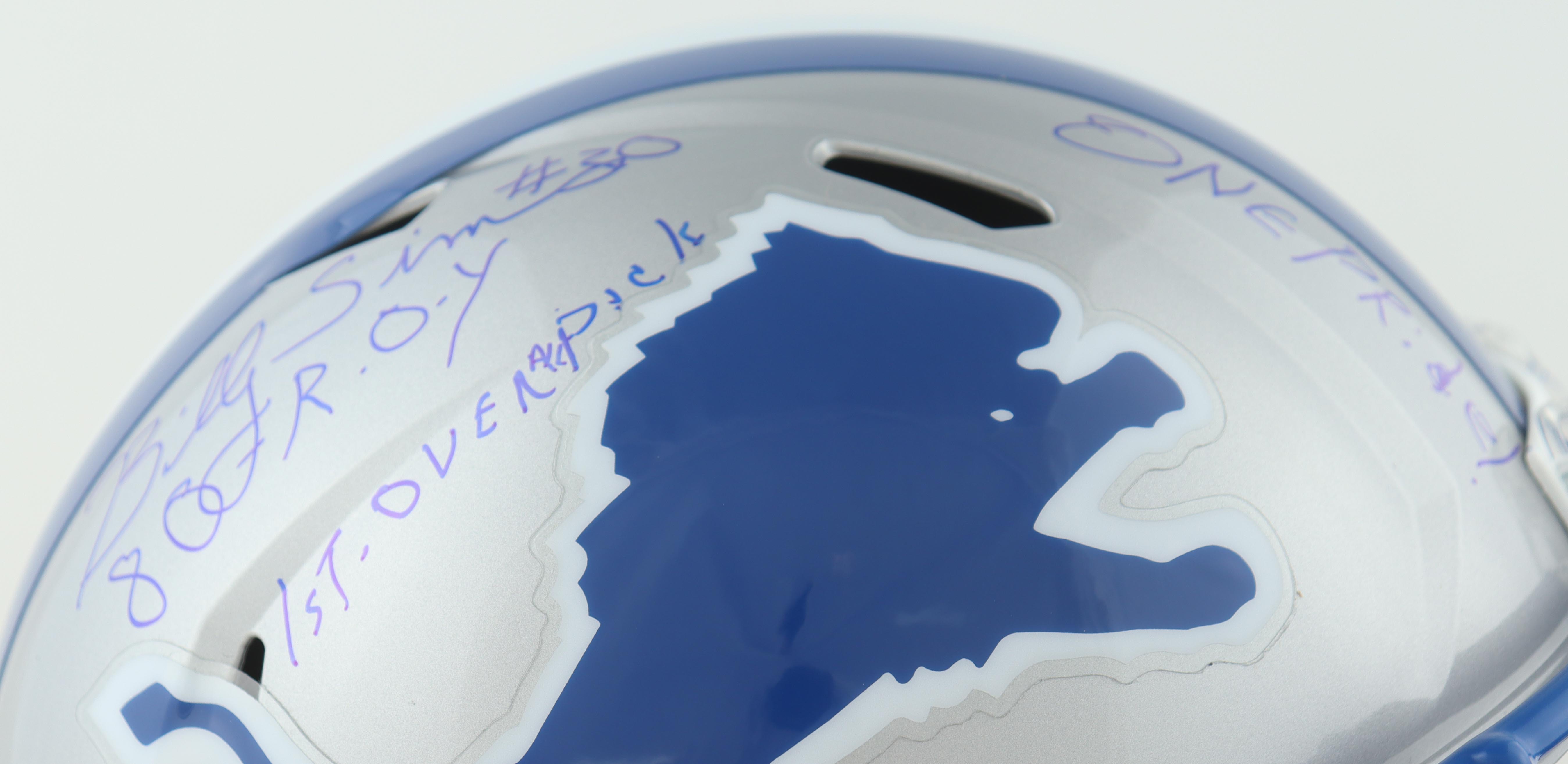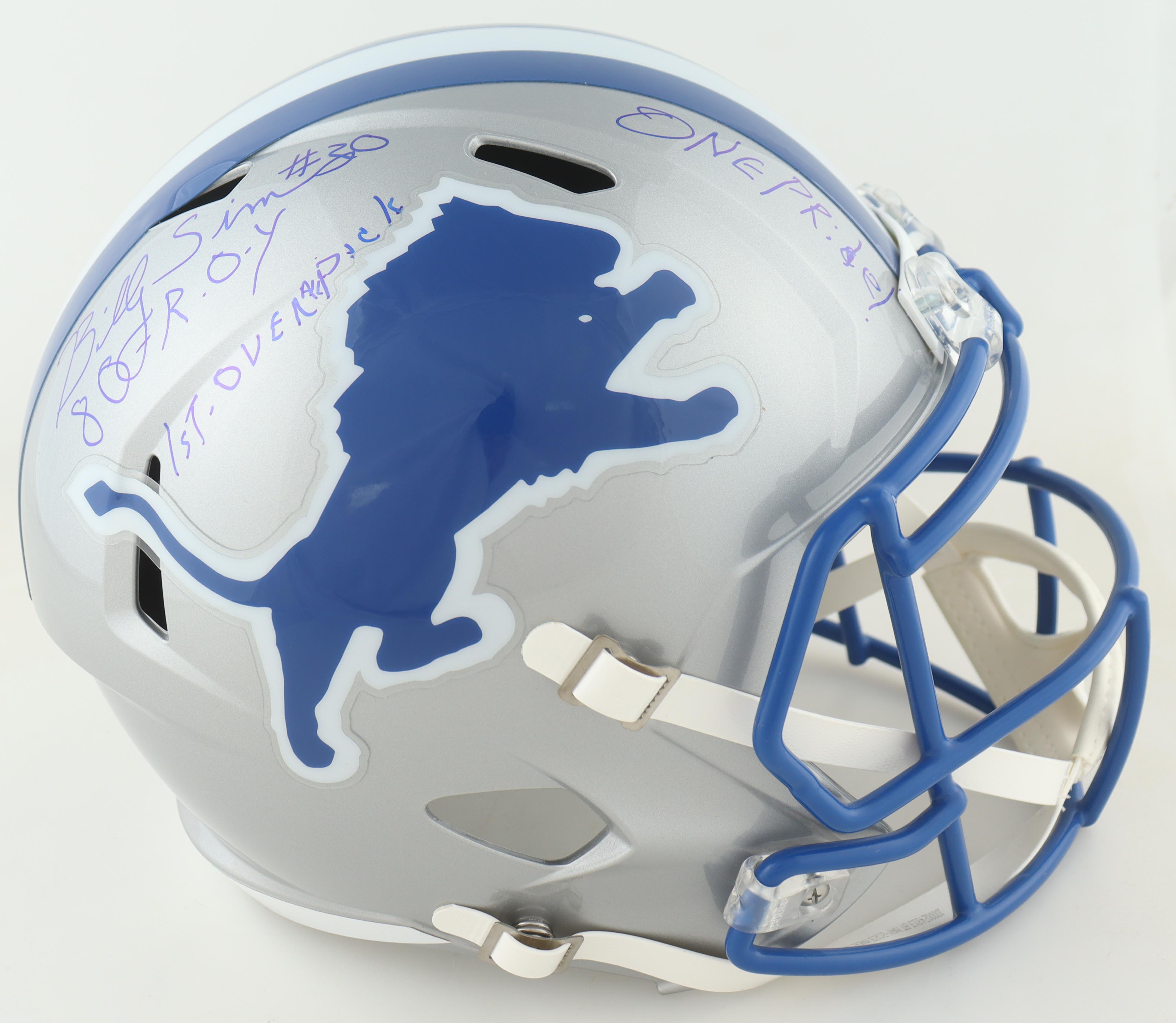Riddell Detroit Lions full-size speed replica helmet. Hand-signed and inscribed by Billy Sims.