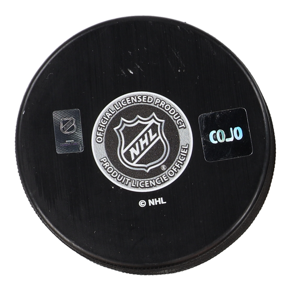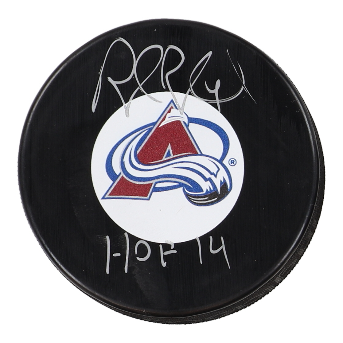 Colorado Avalanche logo hockey puck. Hand-signed and inscribed by Rob Blake (HOF).