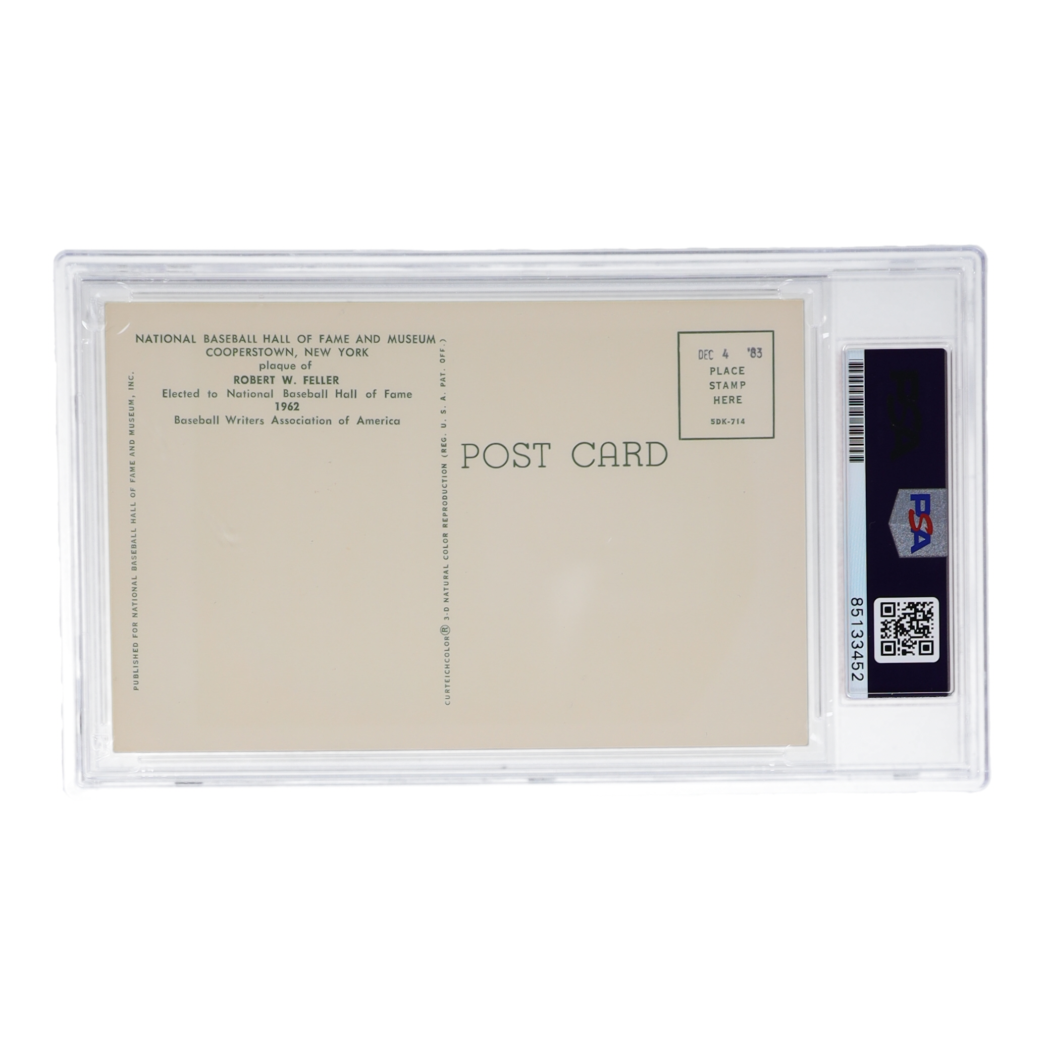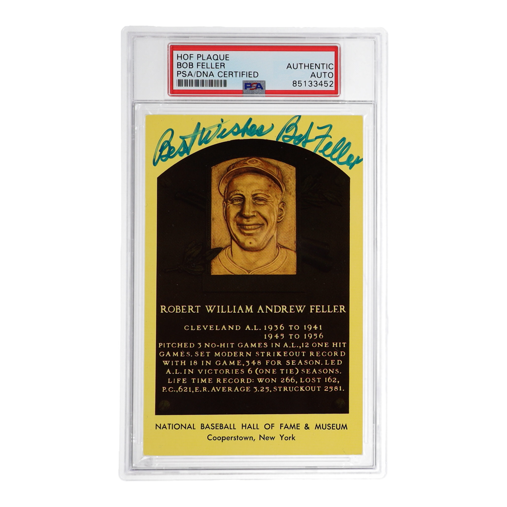 Bob Feller Signed Hall of Fame Plaque Postcard (PSA)