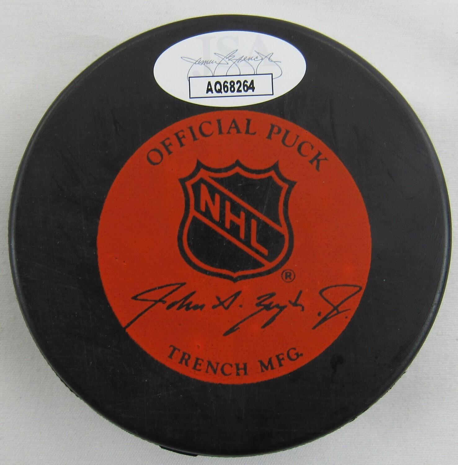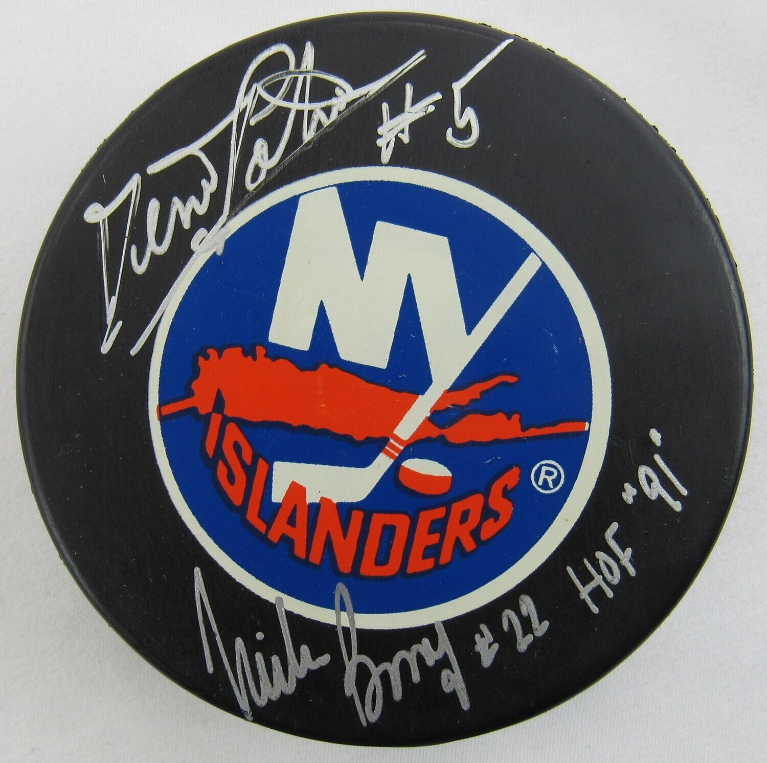 New York Islanders hockey puck has been hand-signed and inscribed by Mike Bossy (HOF) and Denis Potvin (HOF).