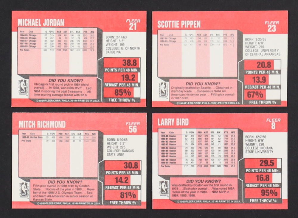 1989-90 Fleer Basketball Complete Set with Stickers of (168) Cards, with Scottie Pippen #23, Larry Bird #8, Mitch Richmond #56, Michael Jordan # 21