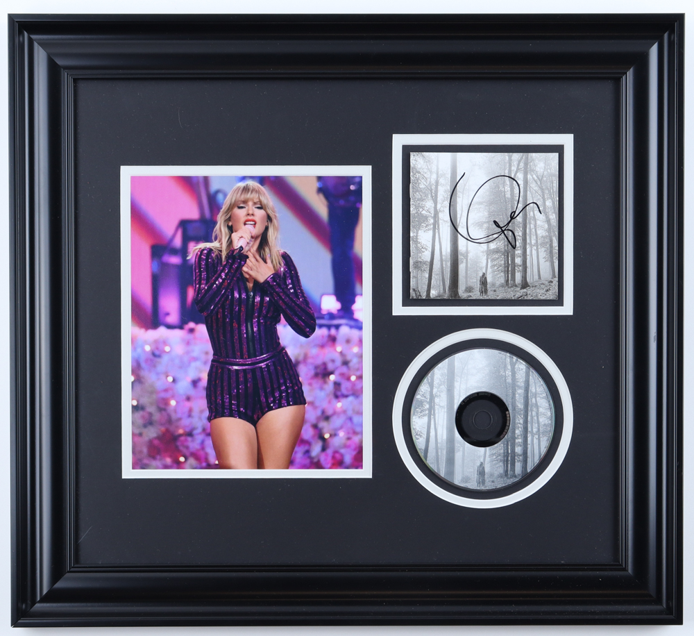 Custom frame measures approximately 19.5" x 21.5" in size and features a "Folklore" CD insert that has been hand-signed by Taylor Swift. The display also includes an unsigned photo and compact disc.