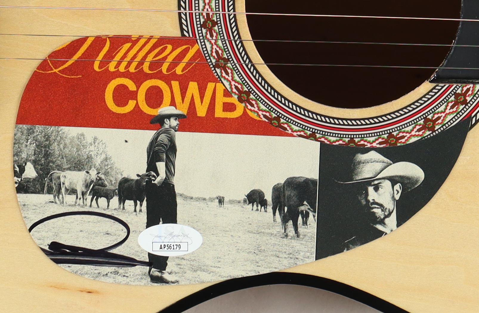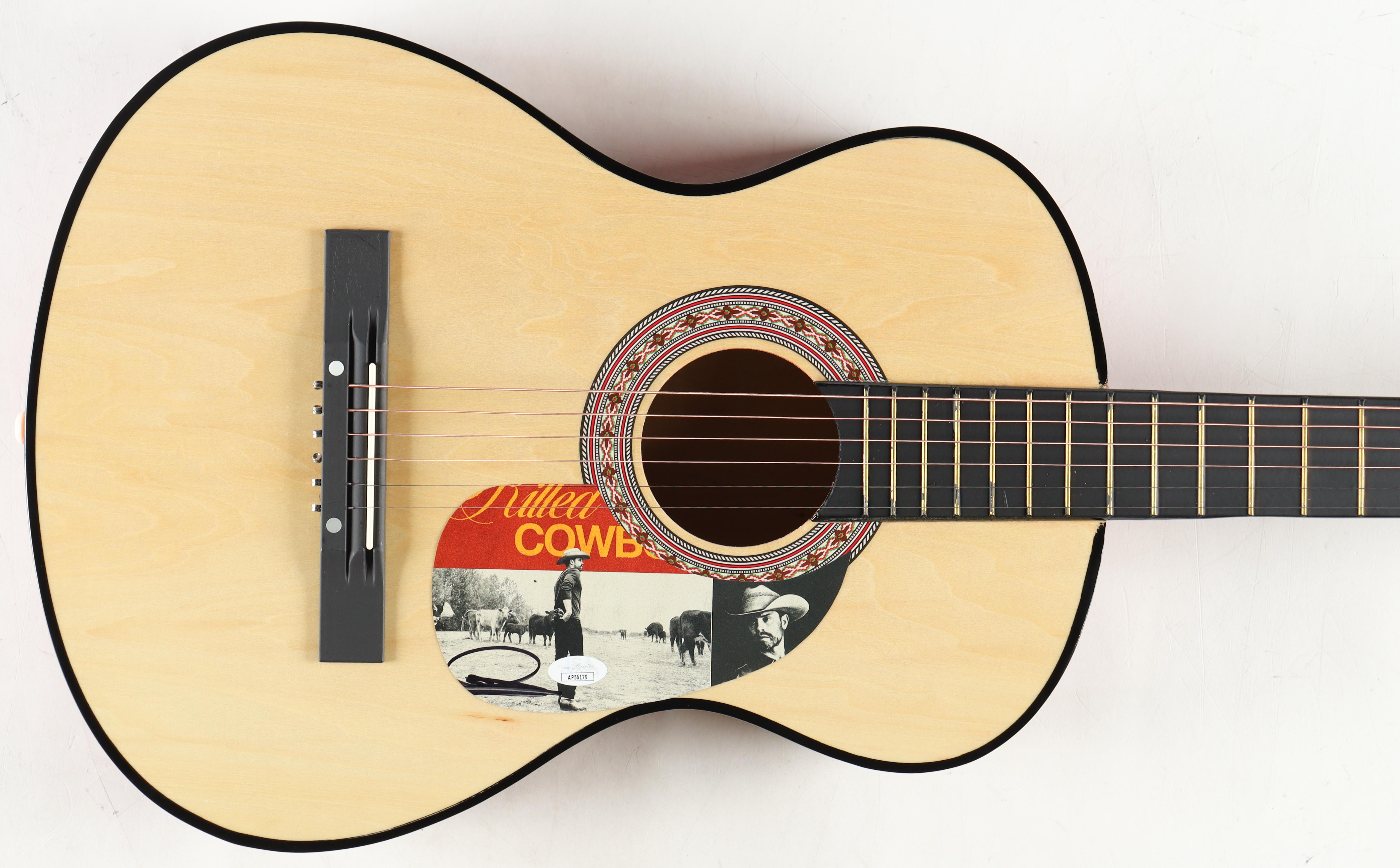 Acoustic Guitar measures approximately 38" in length and has been hand-signed on a CD cover that has been repurposed as the pick-guard by Dustin Lynch.