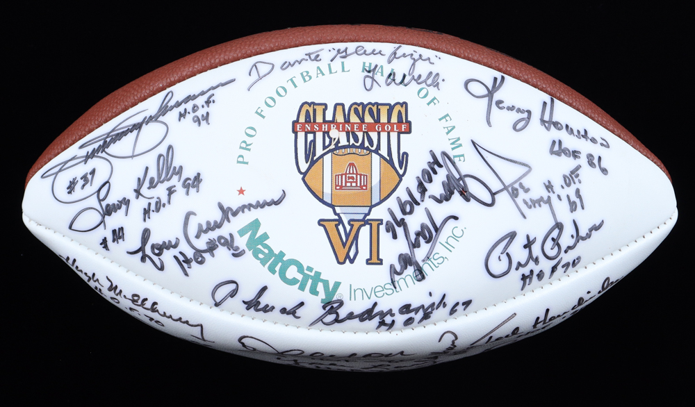 Wilson Official HOF Enshrinee Golf Classic VI NFL white panel football has been hand-signed and inscribed by (29) members of the Pro Football Hall of Fame with Bob St. Clair, Willie Lanier, Dwight Stephenson, John Henry Johnson, Tom Mack, Bobby Bell, Charley Taylor, Anthony Munoz, Lem Barney, Ace Parker, Hugh McElhenney, Chuck Noll, Mel Renfro, Deacon Jones, Yale Lary, Leny Moore, Bobby Mitchell, Dave Wilcox, Billy Shaw, Ted Hendricks, Pete Pihos, Joe Perry, Kenny Houston, Dante Lavelli, Jim Taylor, Chuck Bednarik, Lou Creekmur, Leroy Kelly and Jimmy