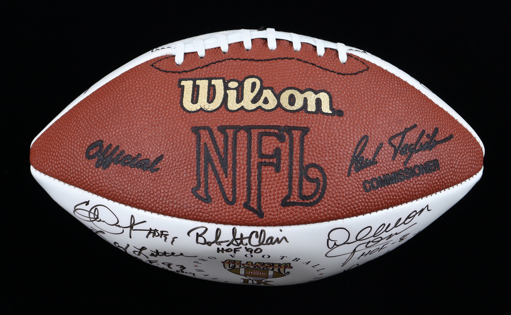 Wilson Official HOF Enshrinee Golf Classic IX NFL white panel football has been hand-signed and inscribed by (30) members of the Pro Football Hall of Fame with Eric Dickerson, Bob St. Clair, Deacon Jones, Dave Wilcox, Lenny Moore, Chuck Bednarik, Bill Dudley, Larry Little, Leroy Kelly, Joe DeLamielleure, Lou Creekmur, Elvin Bethea, Anthony Munoz, Jack Youngblood, Don Maynard, Ted Hendricks, Dwight Stephenson, Hugh McElhenny, Dante Lavelli, Joe Perry, Leroy Kelly, Yale Lary, Tom Mack, Willie Lanier, Chuck Taylor, Jim Kelly, Mel Renfro, Lem Barney, Jim Taylor and Howie Long.