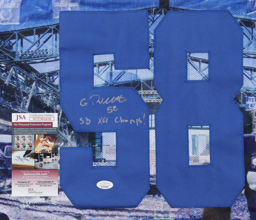 Custom jersey. Everything sewn on, size XL. Hand-signed and inscribed by Gary Brackett.