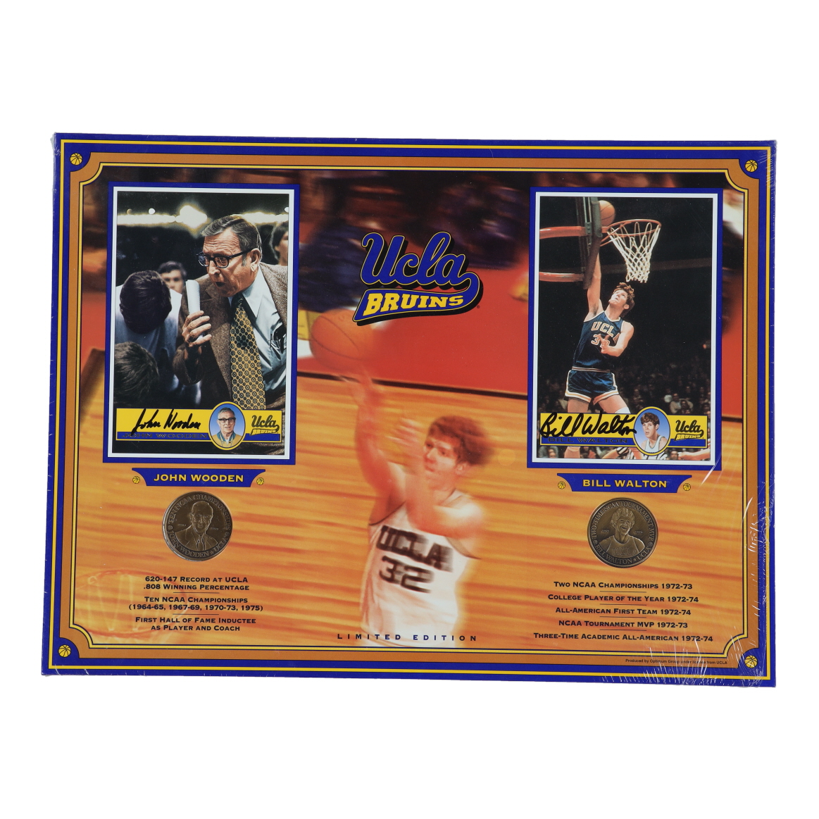 Custom frame measures approximately 12" x 16" in size and features cards that have been hand-signed by John Wooden (D. 2010, UCLA Bruins, HOF) and Bill Walton (UCLA Bruins, HOF). Display also features (2) bronze coins.