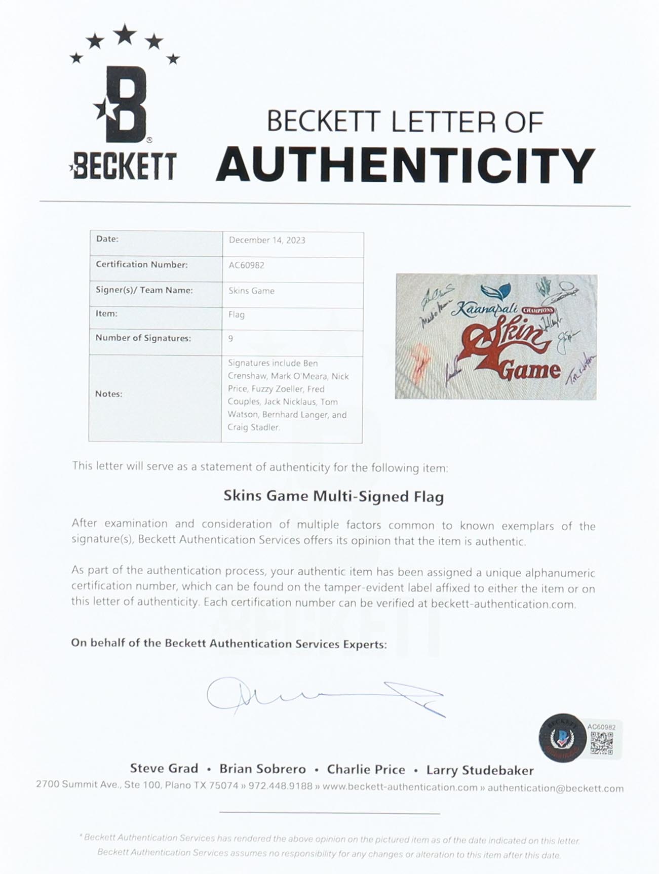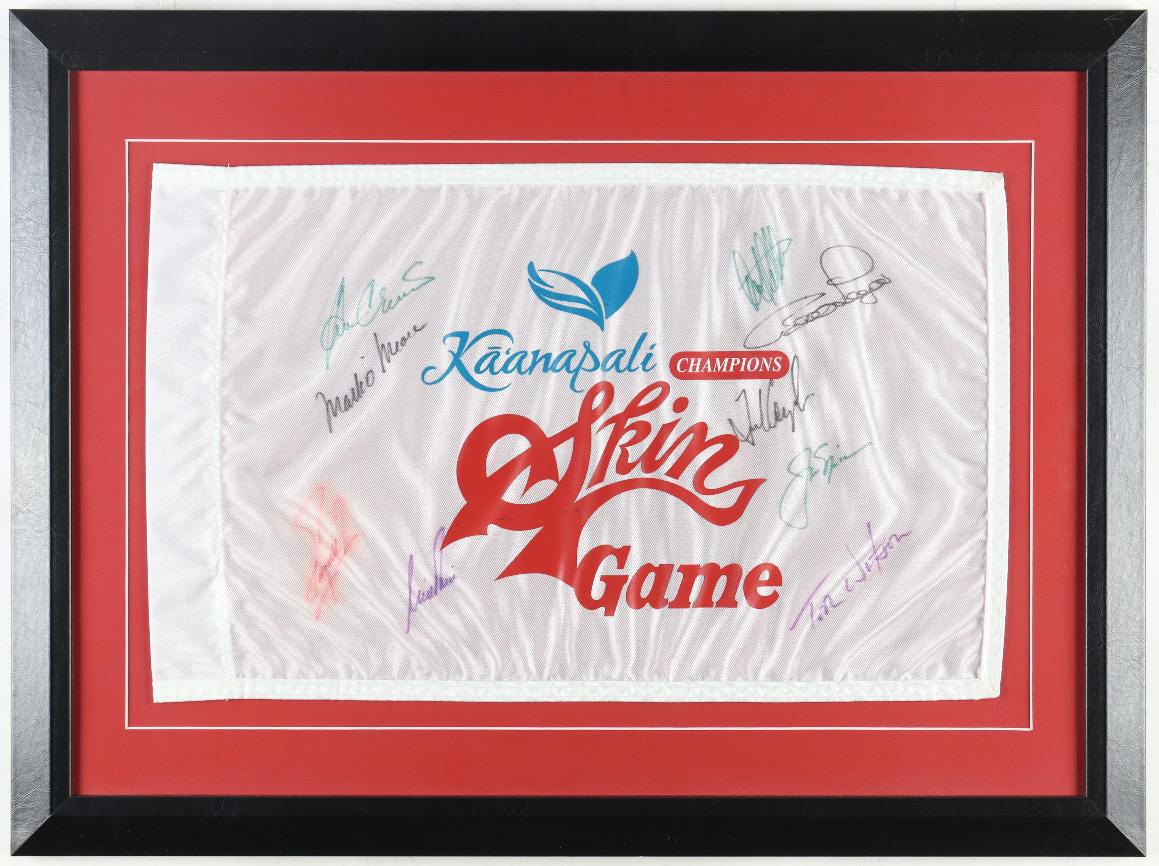 Custom frame measures approximately 21" x 28" in size and features a Kaanapali Skin Game Champions flag that has been hand-signed by (9) with Jack Nicklaus (HOF), Fred Couples (HOF), Nick Price (HOF), Ben Crenshaw (HOF), Mark O'Meara (HOF), Fuzzy Zoeller, Tom Watson (HOF), Bernhard Langer (HOF), and Craig Stadler.