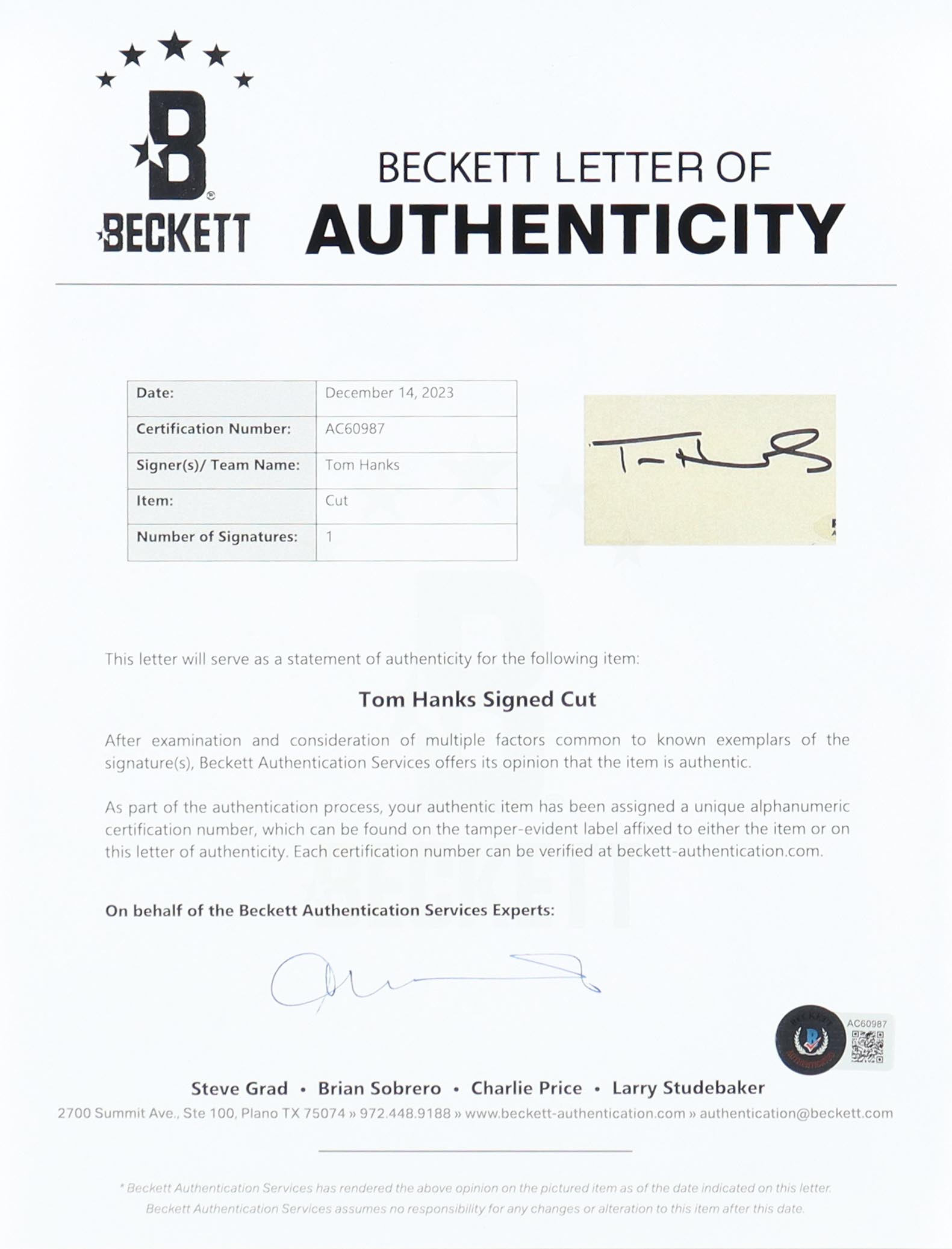 Custom framed display measures approximately 17" x 24" in size and features a cut that has been hand-signed by Tom Hanks.