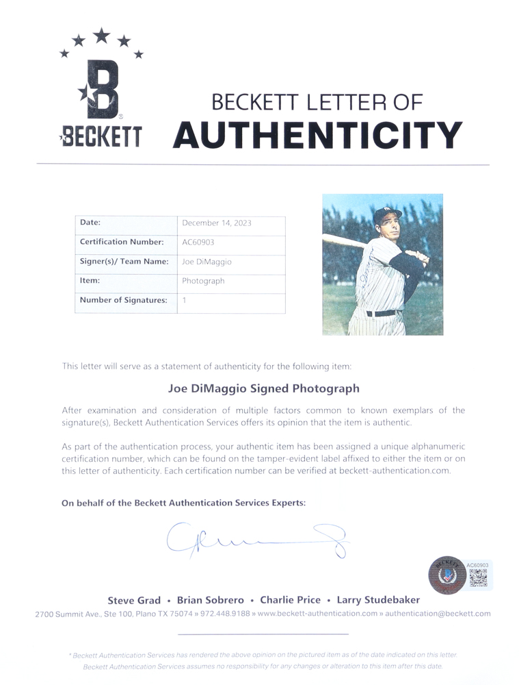 The autograph includes an official Beckett Authentication Services hologram and matching LOA for authenticity purposes.