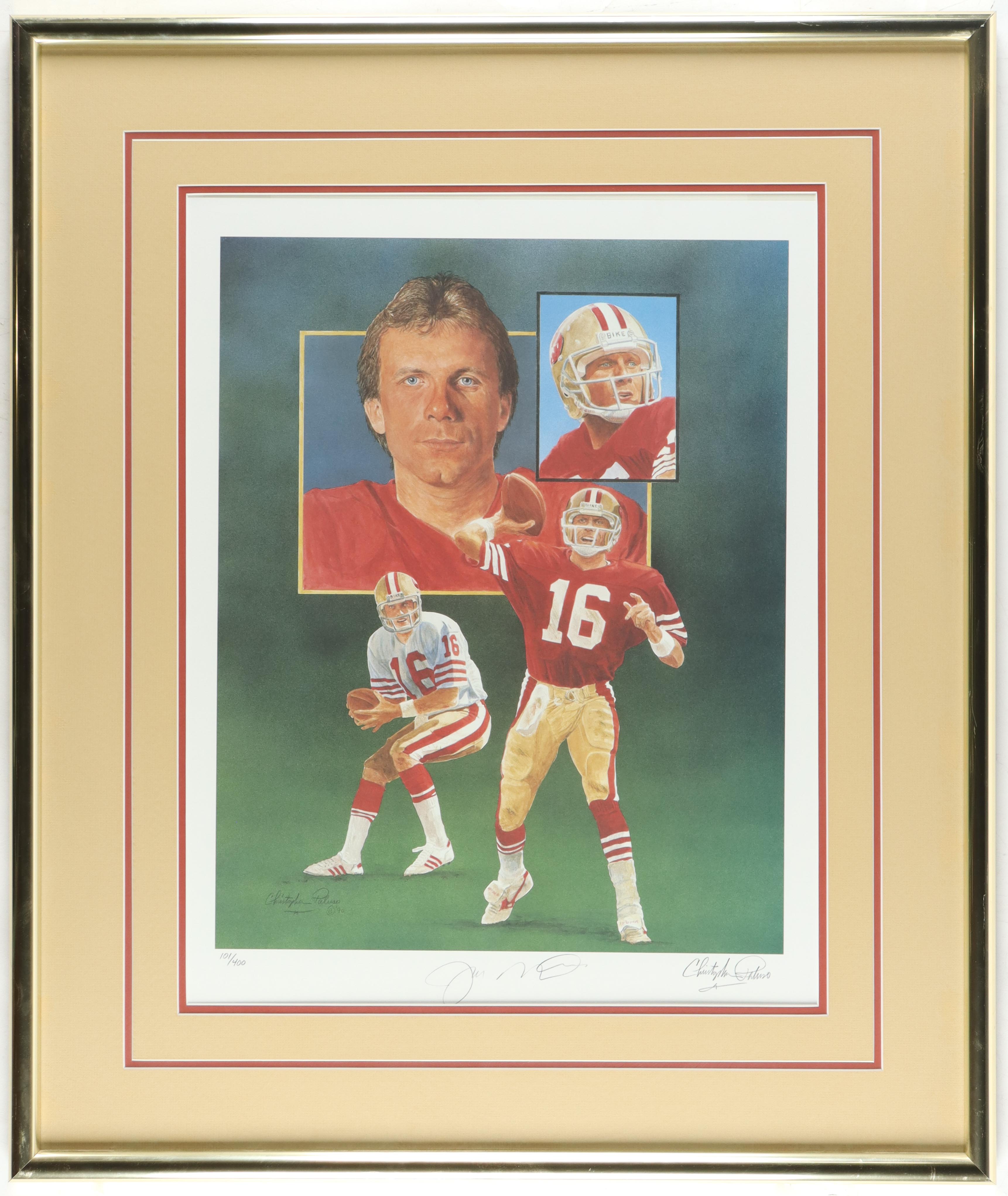 Custom frame measures 27.5" x 32.5" in size and features an lithograph that has been hand-signed by Joe Montana (San Francisco 49ers, HOF) and Christopher Paluso (Artist). The lithograph is limited edition and has been hand-numbered #101 / 400.