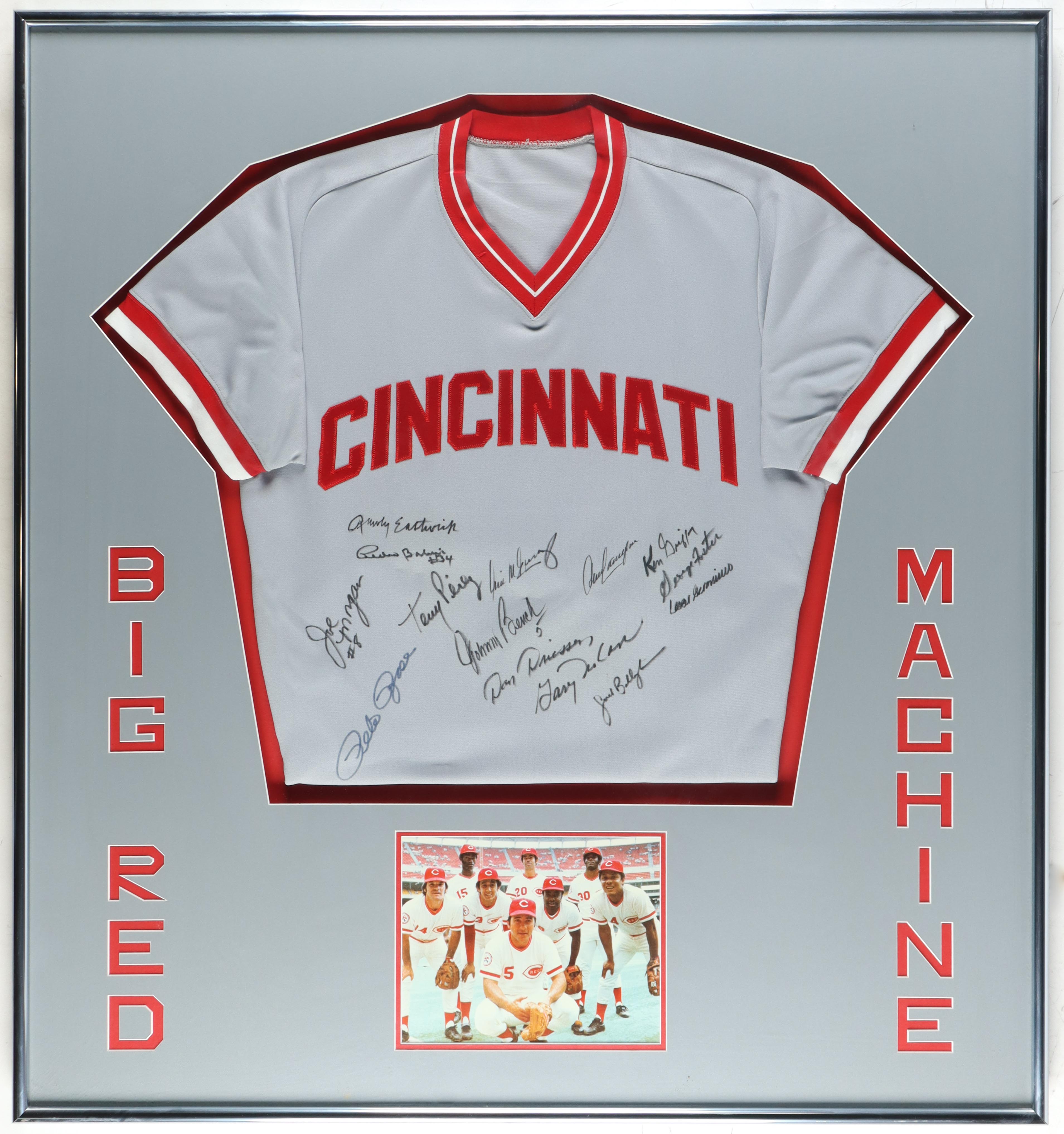 Display measures approximately 38" x 41" in size. Features a jersey that has been hand-signed by Johnny Bench, Pete Rose, Joe Morgan, Tony Perez, Rawly Eastwick, Pedro Borbon, George Foster, Cesar Geronimo, Ken Griffey, Dan Driessen, Dave Concepcion, Will McEnaney, Jack Billingham & Gary Nolan. Please refer to photos for more details on condition of the display.