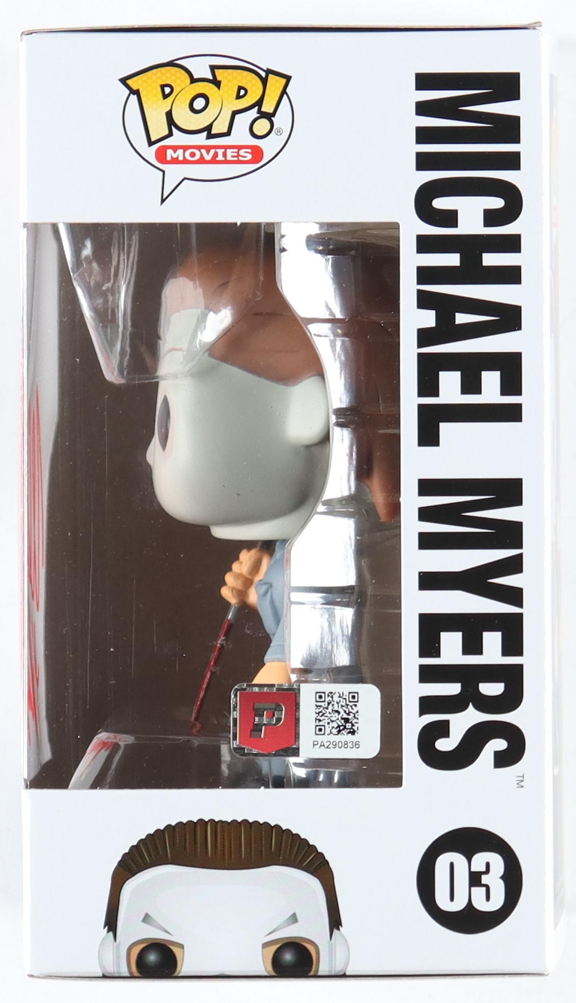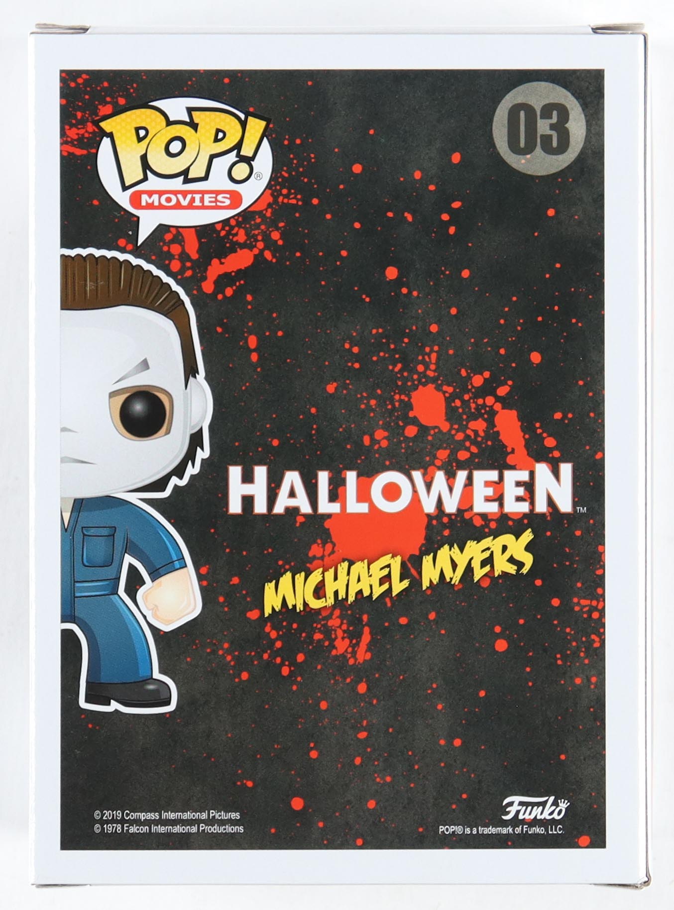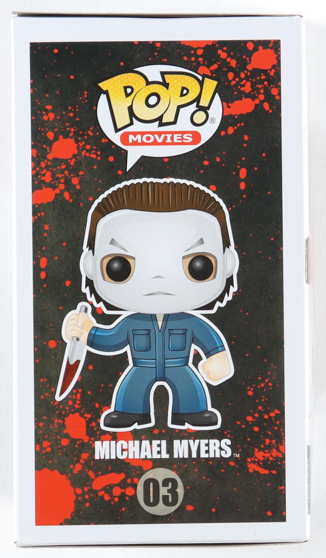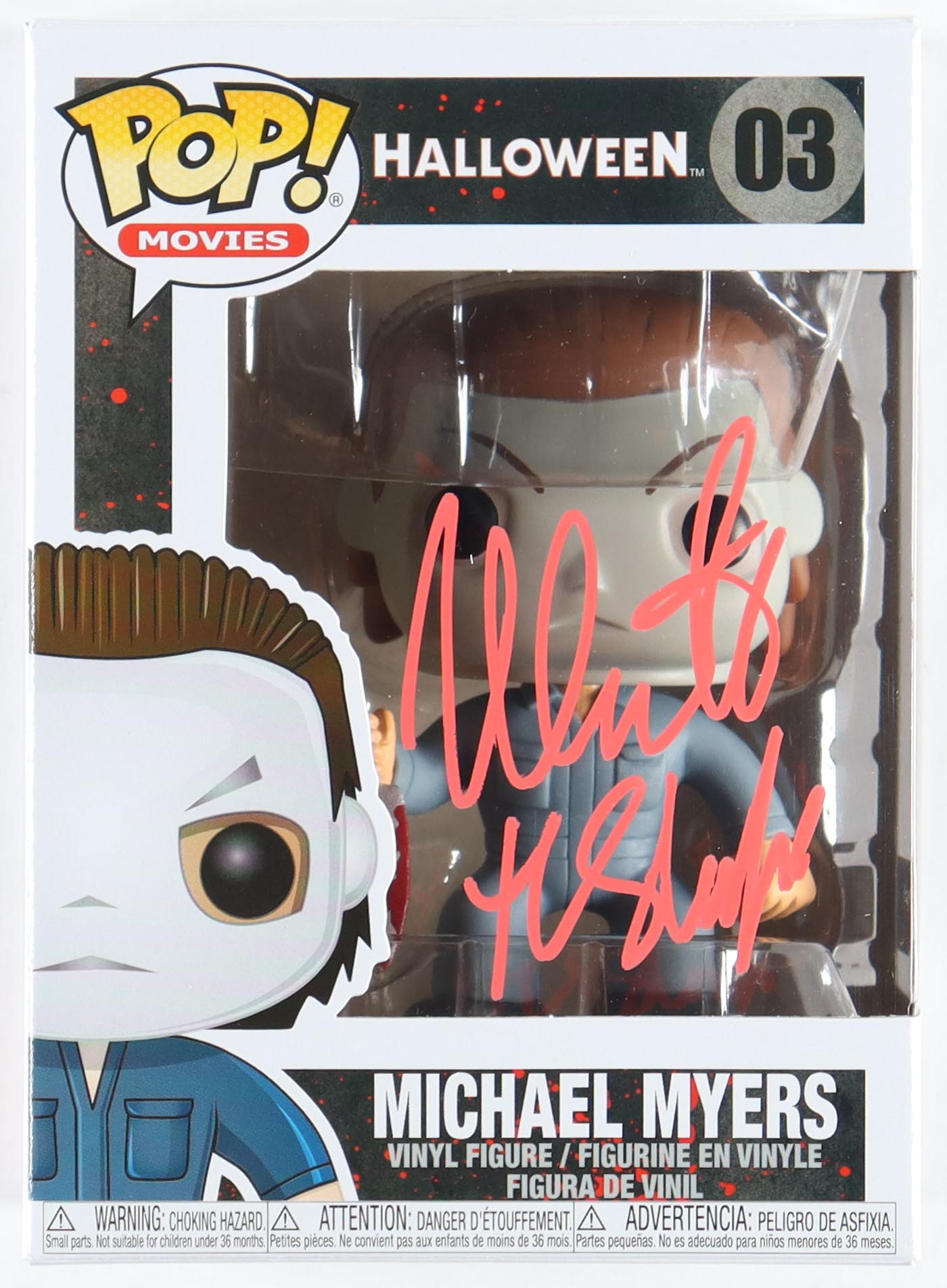 Funko Pop! vinyl figure measures approximately 4" tall. Hand-signed and inscribed on the packaging by Nick Castle (Michael Meyers).
