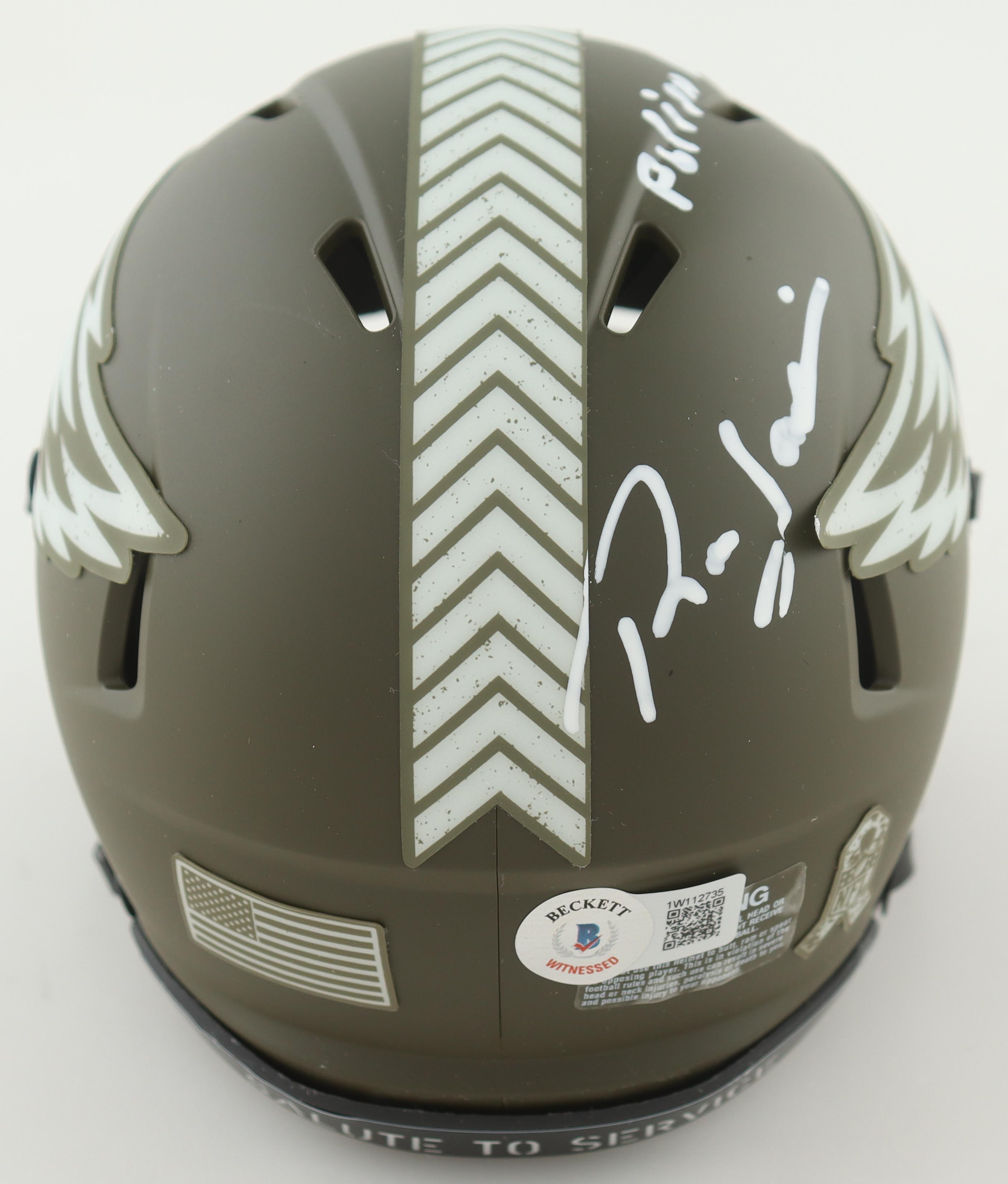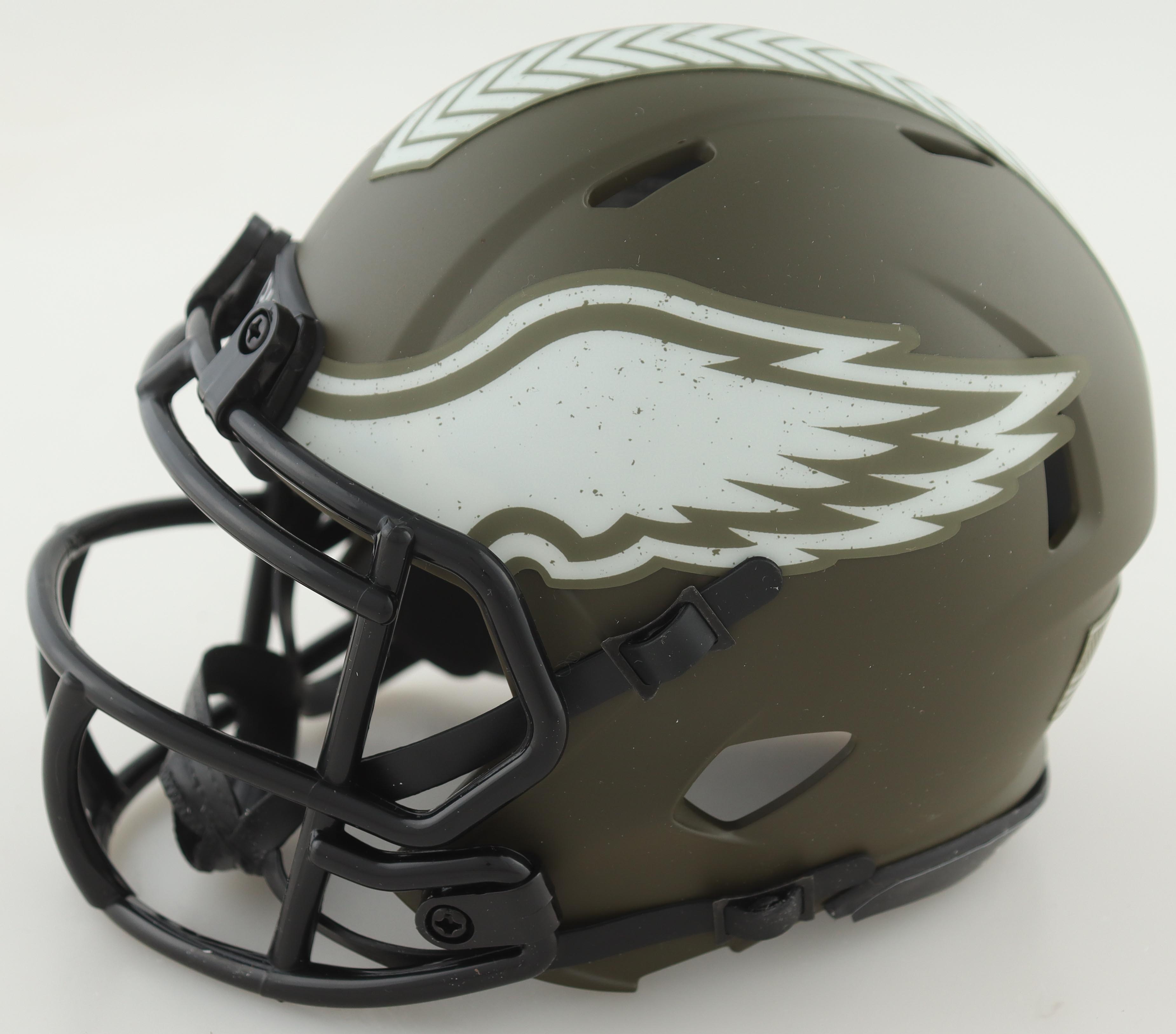 Riddell Philadelphia Eagles Salute To Service speed mini helmet. Hand-signed and inscribed by Ron Jaworski.