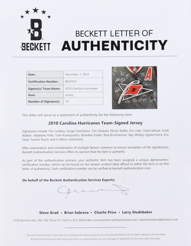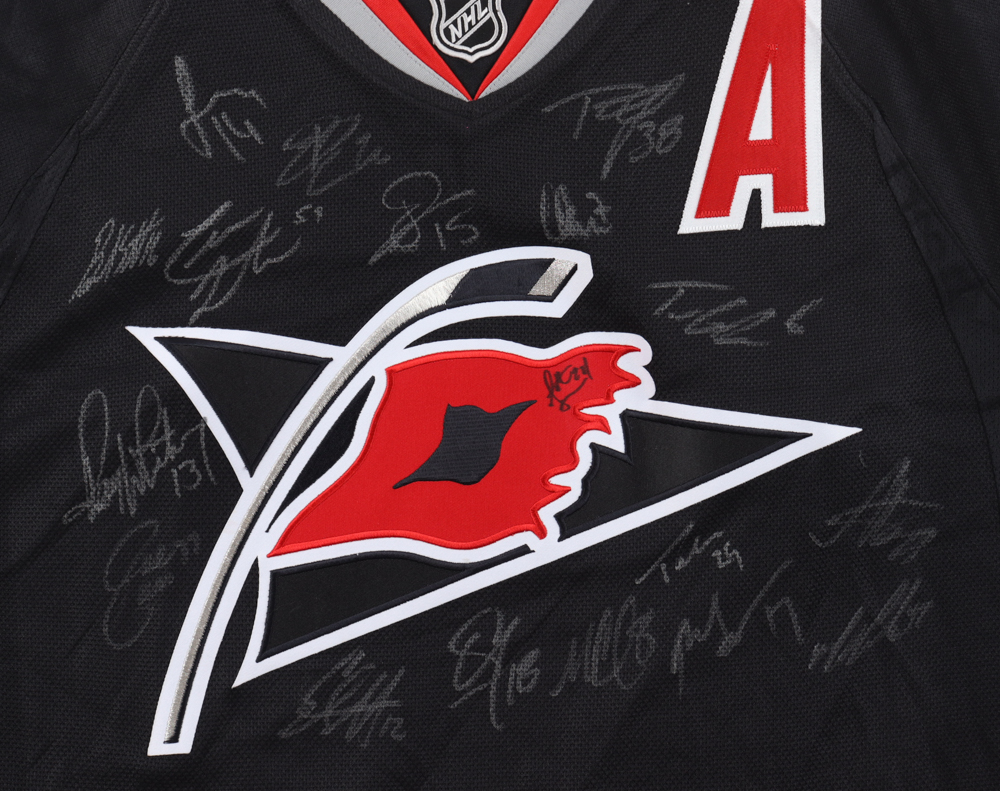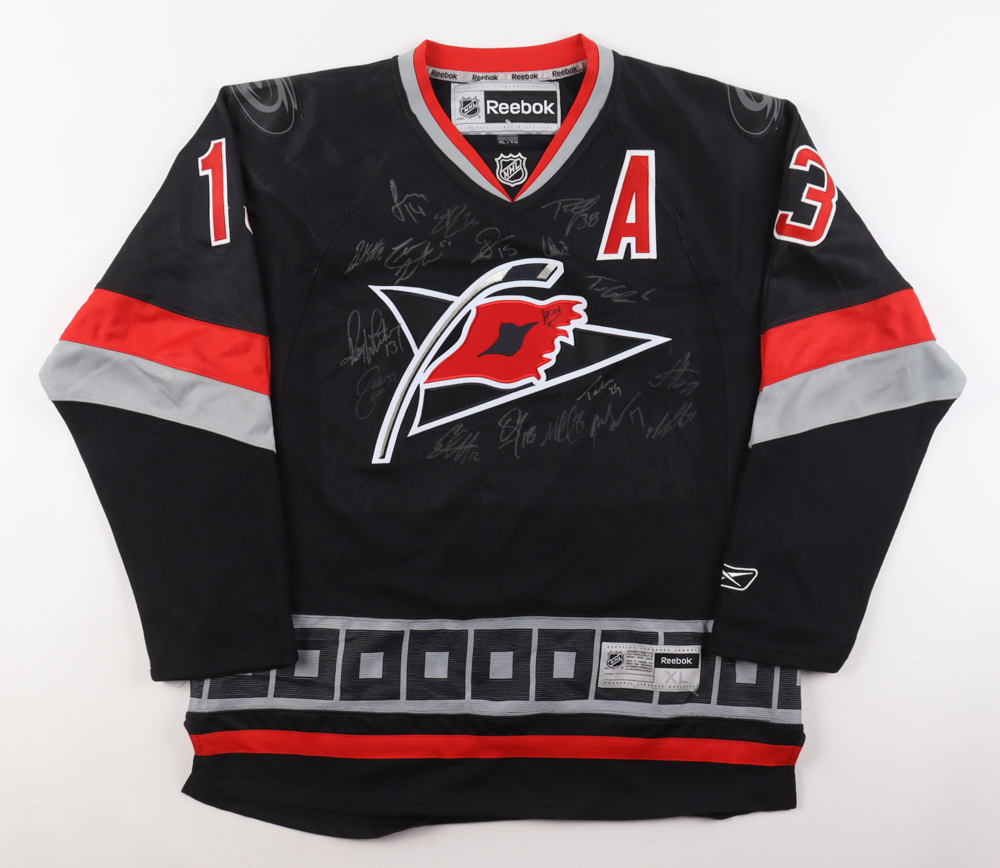 Reebok jersey with everything pressed on, size XL. Hand-signed by Ray Whitney twice, Tim Conboy, Sergei Samsonov, Tim Gleason, Niclas Wallin, Eric Cole, Chad LaRose, Scott Walker, Stephane Yelle, Tom Kostopoulos, Brandon Sutter, Rod Brind'amour, Eric Staal, Tuomo Ruutu, and 4 others (unknown) (2010 Carolina Hurricanes).