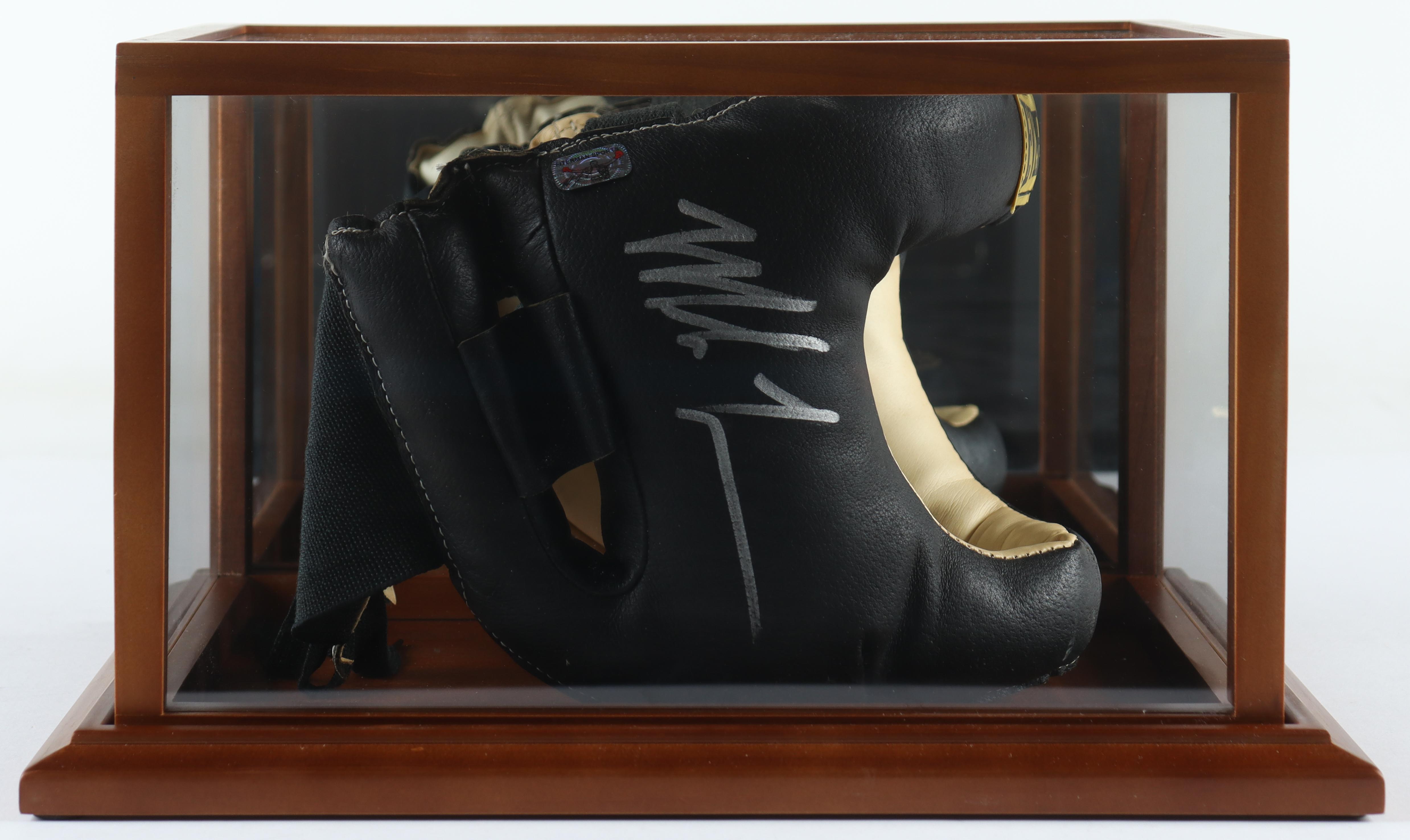 Everlast leather boxing professional headgear with display case. The headgear has been hand-signed by Mike Tyson (HOF). Display case included.