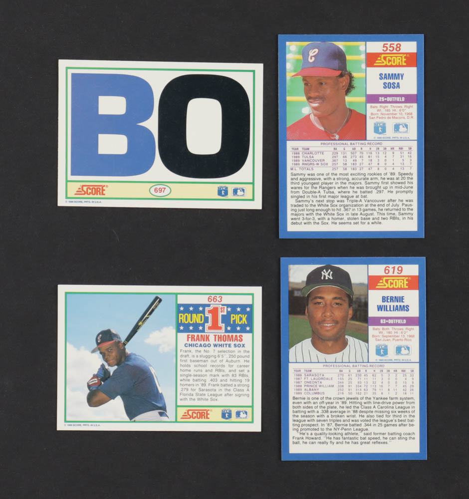 1990 Score Collector Set Baseball Edition Complete Set (714) Cards with Bo Jackson #697 FB/BB, Sammy Sosa #558 RC, Frank Thomas #663 RC, Bernie Williams #619 RC