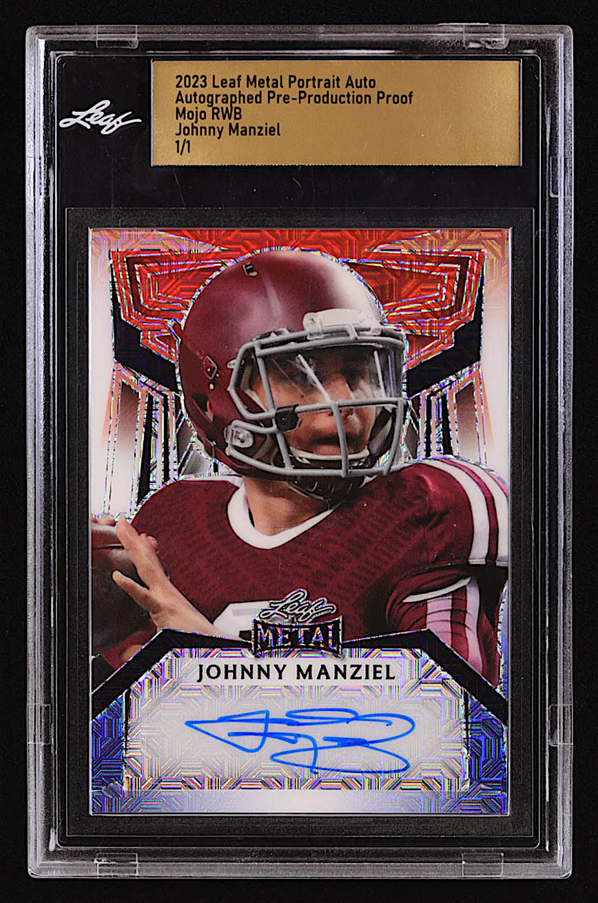 Johnny Manziel 2023 Leaf Metal Portrait Autograph Red White and Blue Mojo Pre-Production Proof #NNO #1/1 (Leaf)