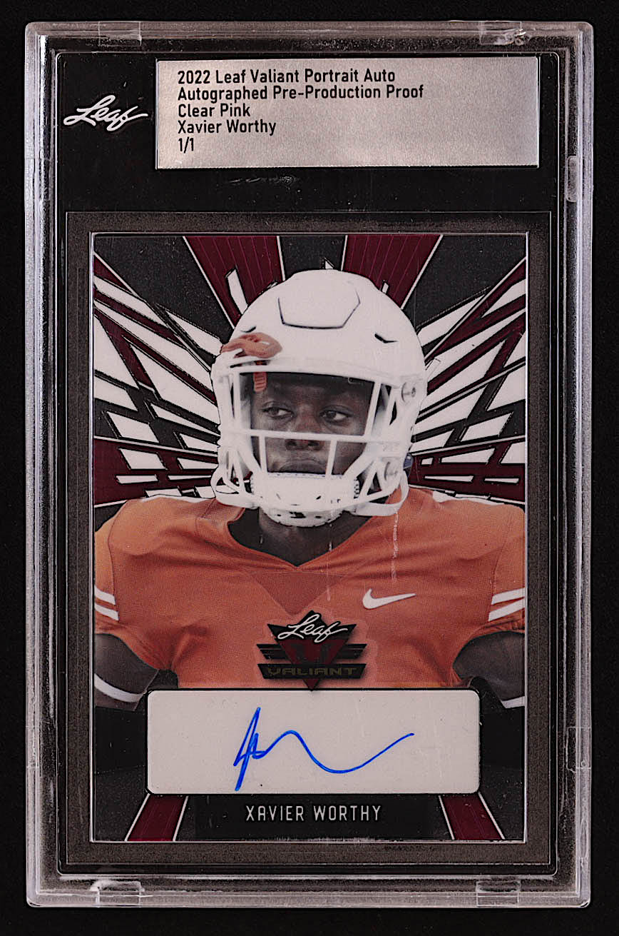 Xavier Worthy 2022 Leaf Valiant Portrait Autograph Clear Pink Pre-Production Proof #NNO RC #1/1 (Leaf)