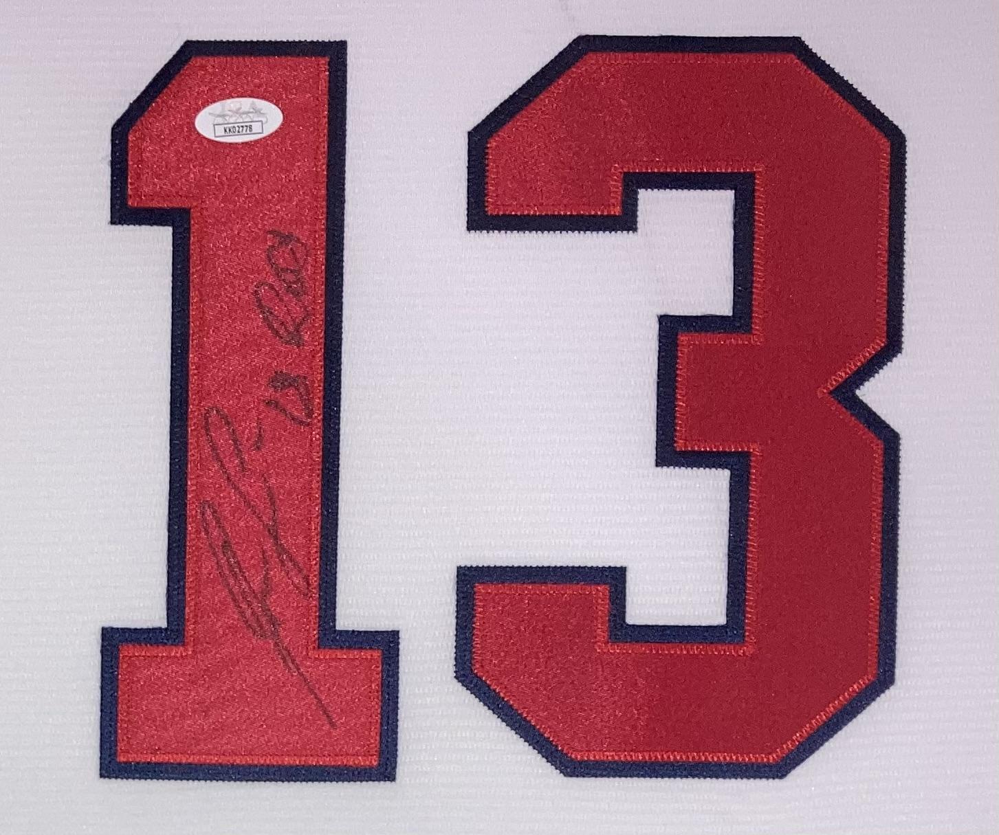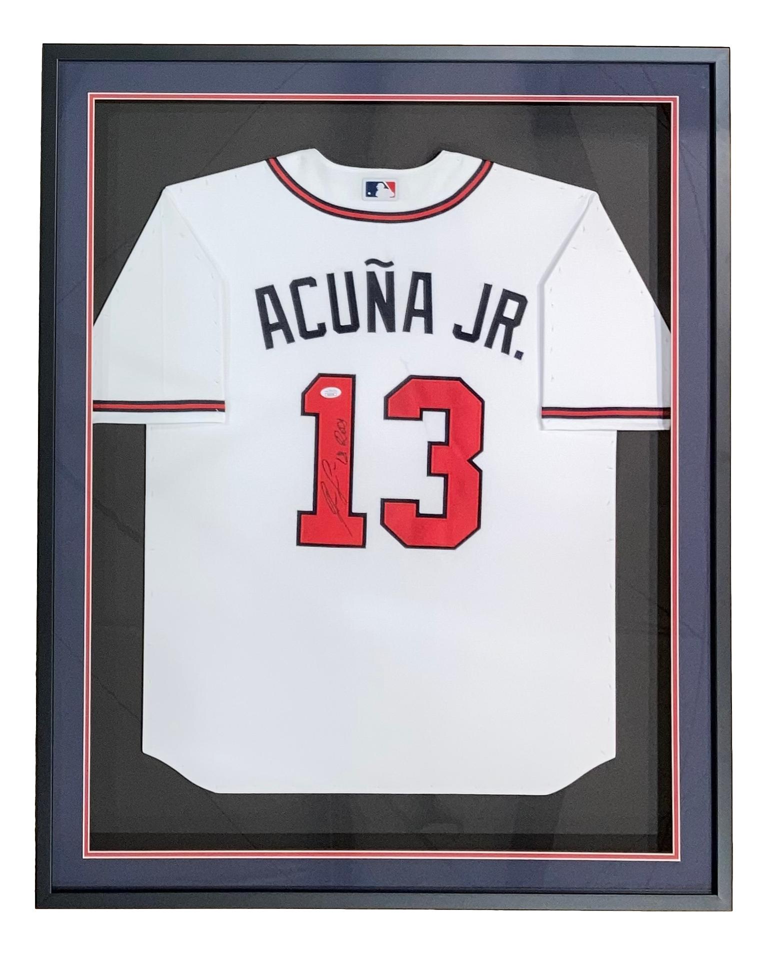 Custom frame measures 36" x 42" in size and features a Nike jersey that has been hand signed and inscribed by Ronald Acuna Jr.