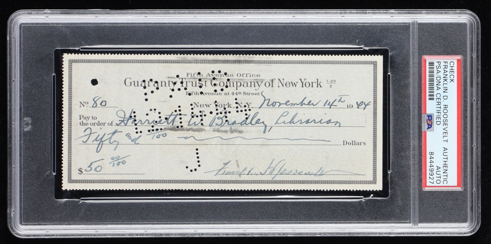 Guaranty Trust Company of New York Personal bank check dated November 14th, 1944. Hand-signed by the 32nd President of The United States, Franklin D. Roosevelt! The check was made out to Harriett Bradley and was in the amount of $50.
