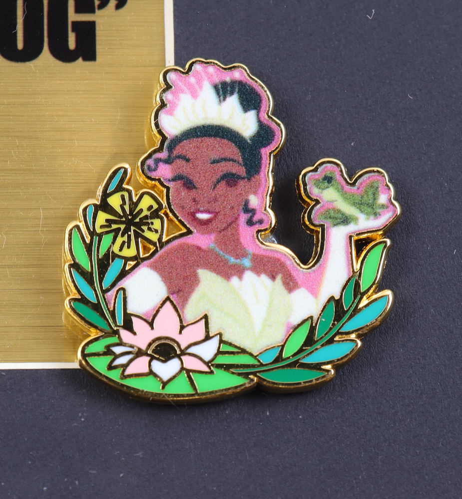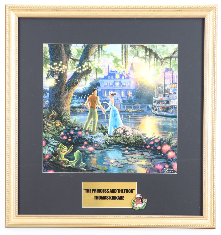 Custom frame display measures 18" x 19" in size and features a print of "The Princess and the Frog" by Thomas Kinkade (D. 2012). Display also includes a Princess Tiana Disney Pin. Please note, display is unsigned.