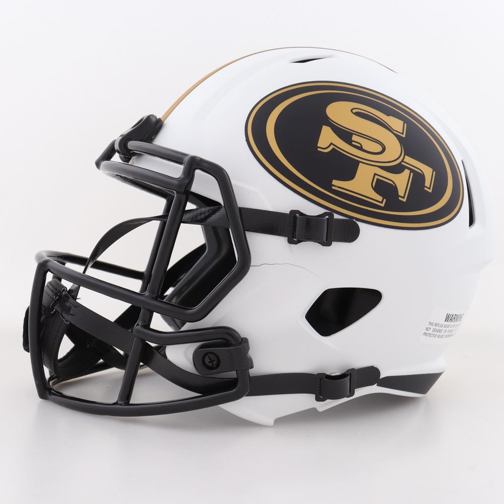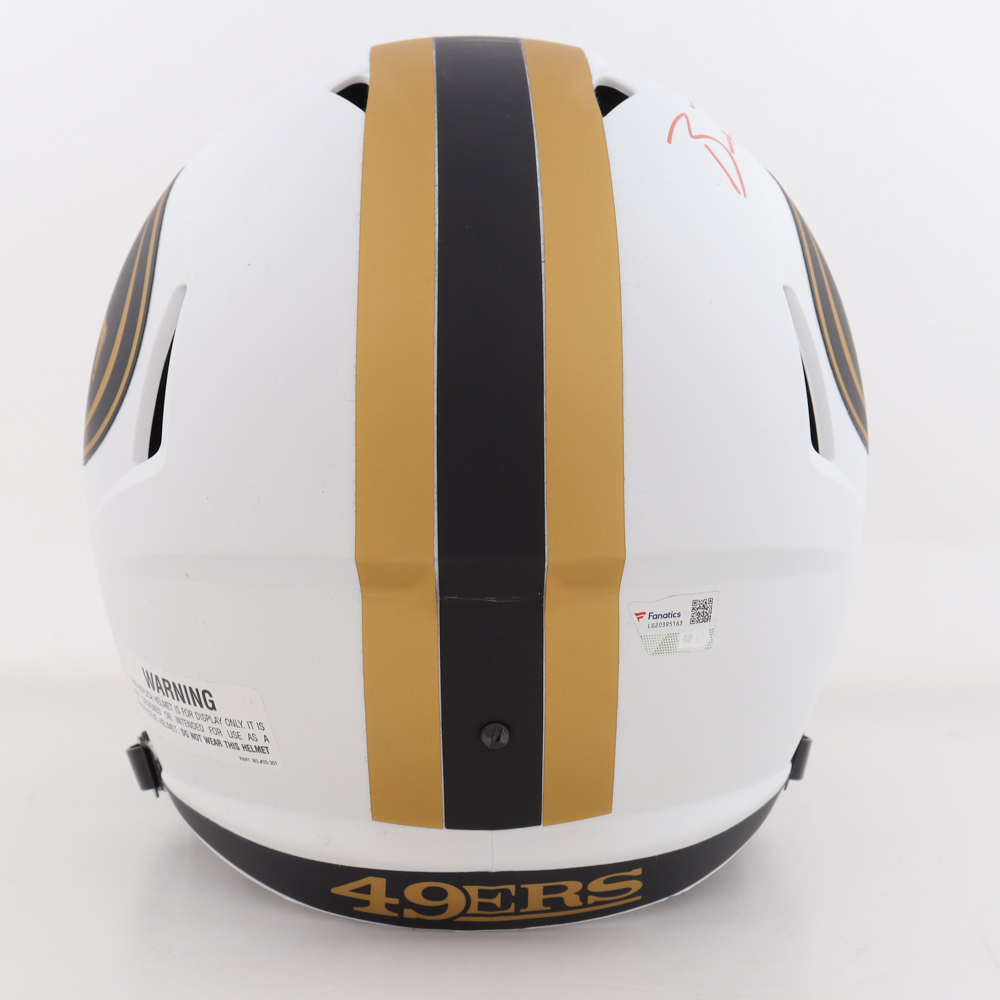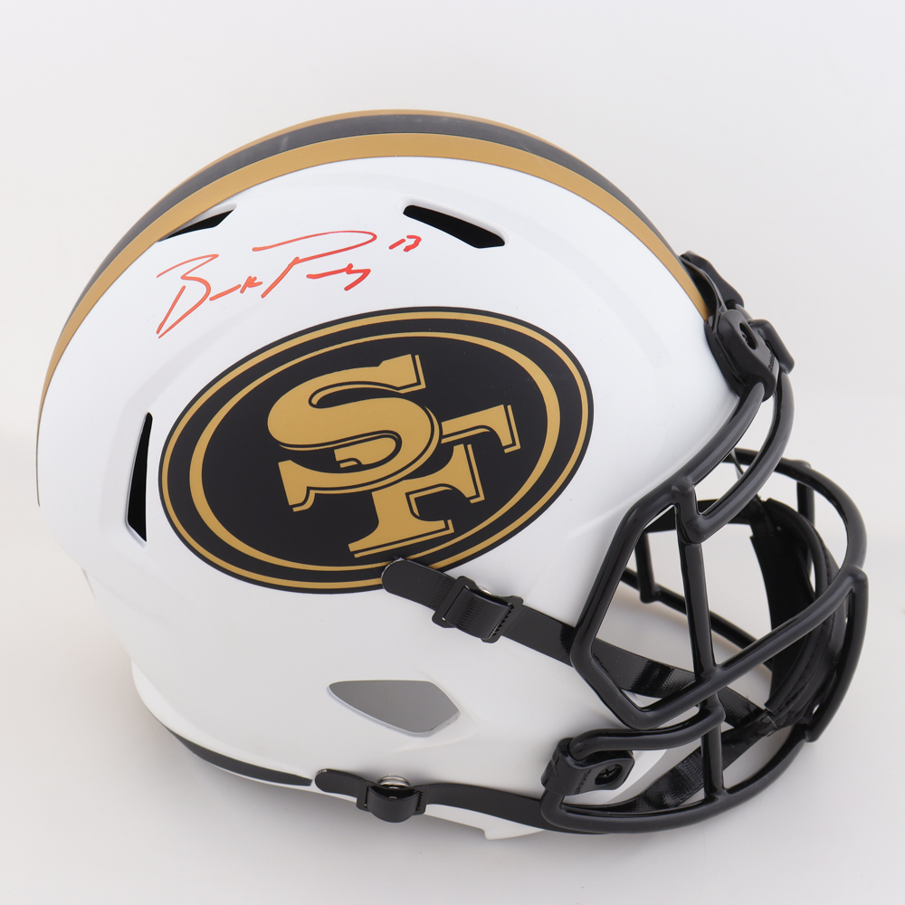 Riddell San Francisco 49ers full-size replica lunar eclipse alternate speed helmet. Hand-signed by Brock Purdy. Please note, there is a crack on the side of the helmet opposite the autographed side.