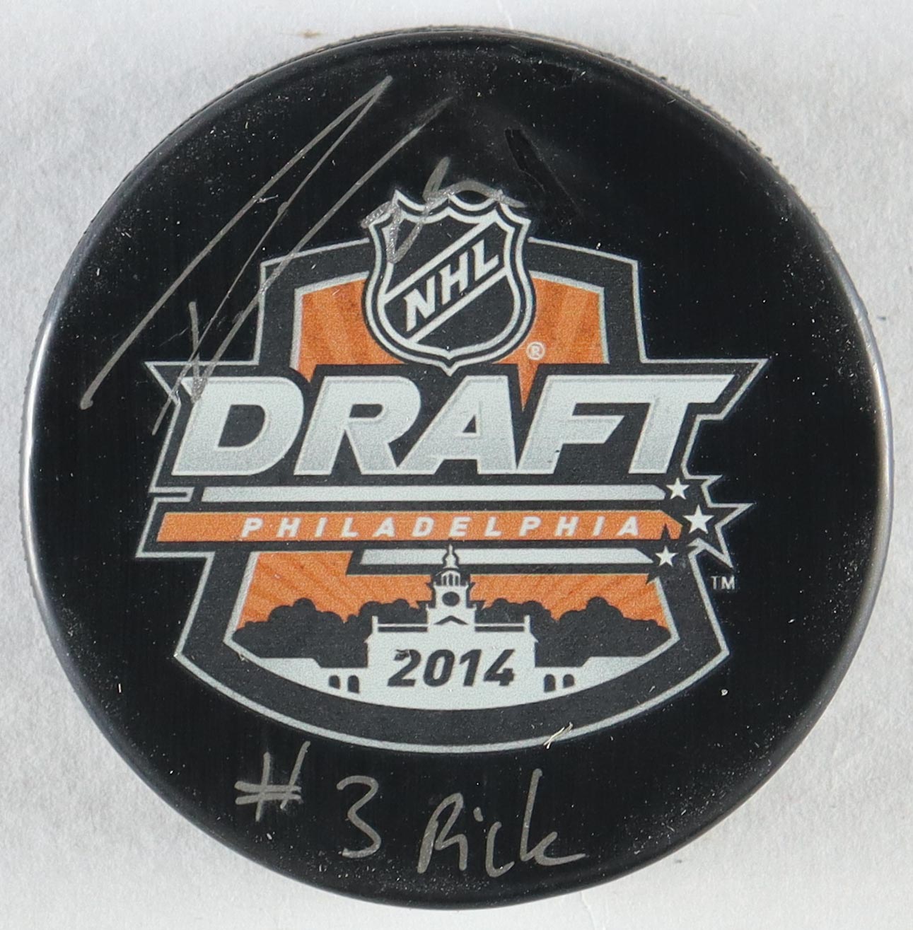 Philadelphia 2014 NHL Draft Logo hockey puck has been hand-signed and inscribed by Leon Draisaitl. Please note, the signature is smudged.