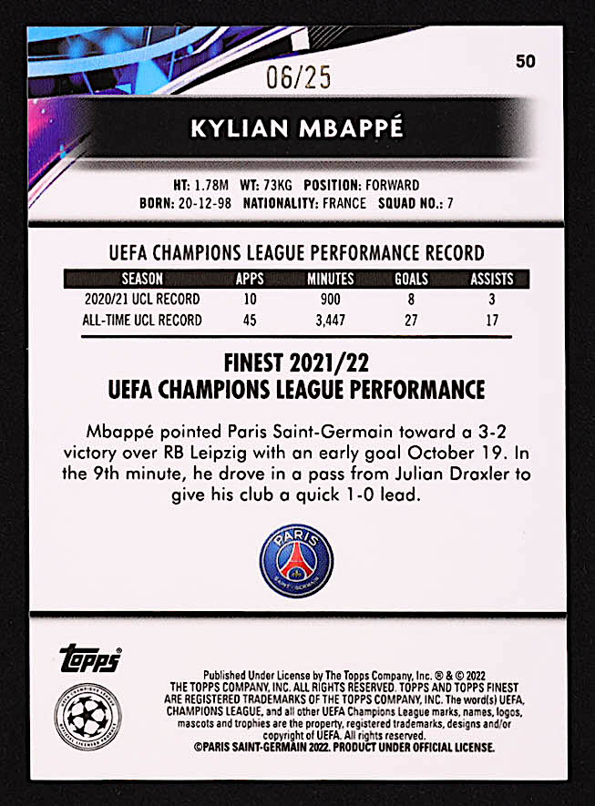 Kylian Mbappe 2021-22 Finest UEFA Champions League Orange Refractors #50 #06/25