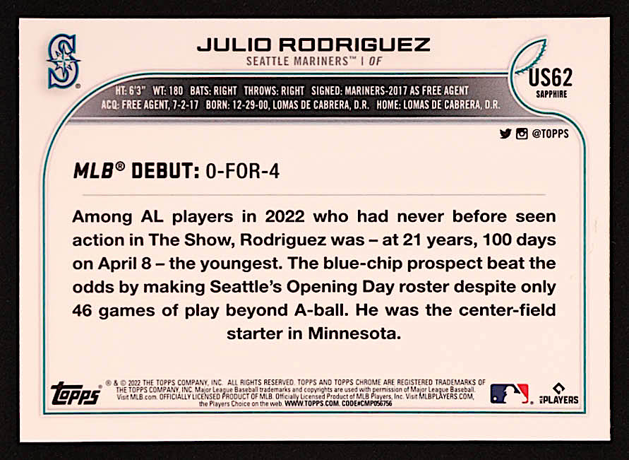 Julio Rodriguez 2022 Topps Chrome Update Sapphire #US62 RC