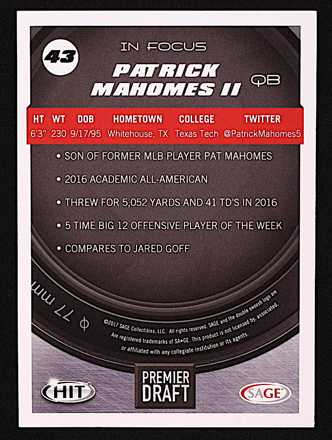 Patrick Mahomes II 2017 SAGE HIT Premier Draft #43 IF RC