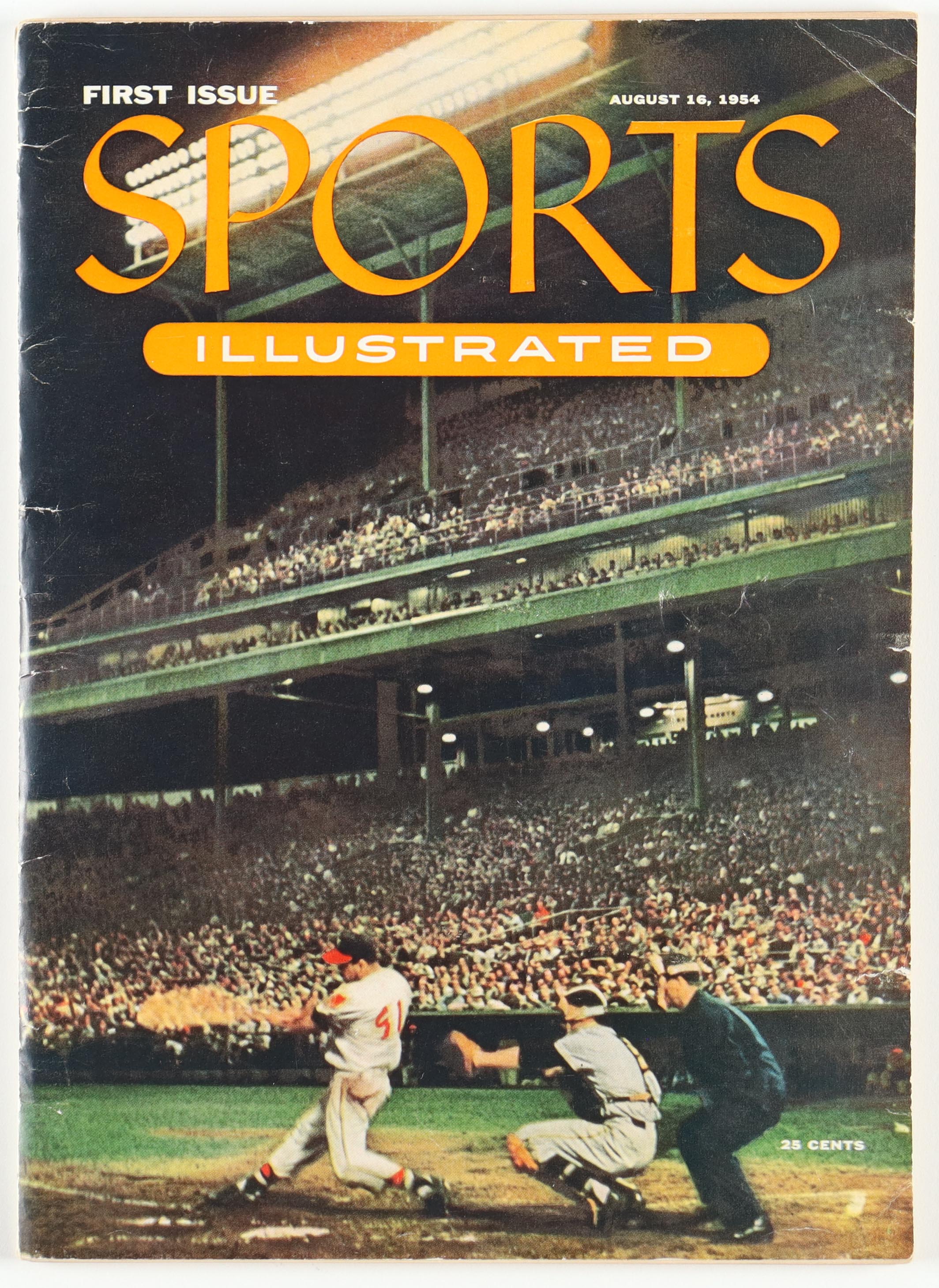 Sports Illustrated First Issue Dated August 16, 1954. Includes an original 1954 Topps uncut card sheet with Jackie Robinson, Ted Williams & Willie Mays. Please refer to photos for condition of the items.