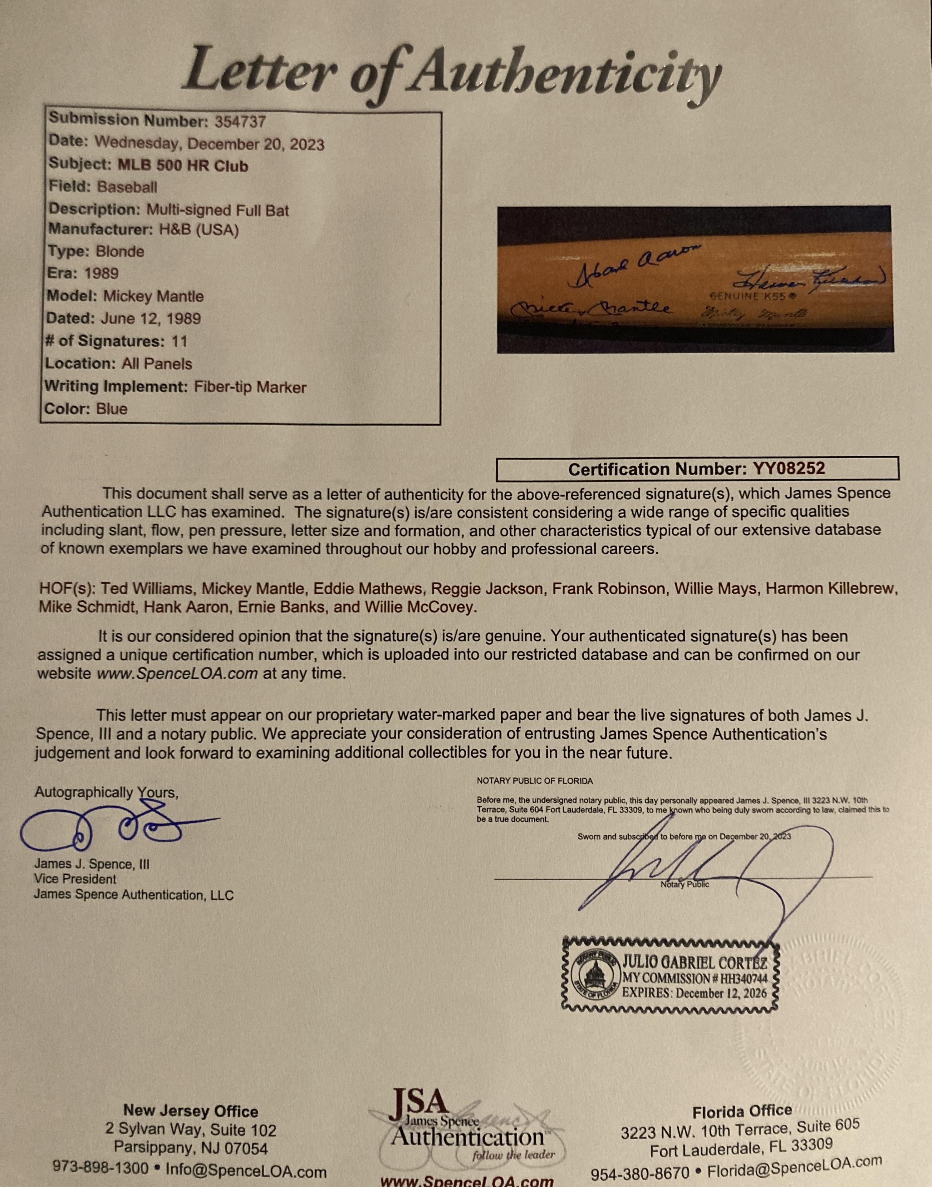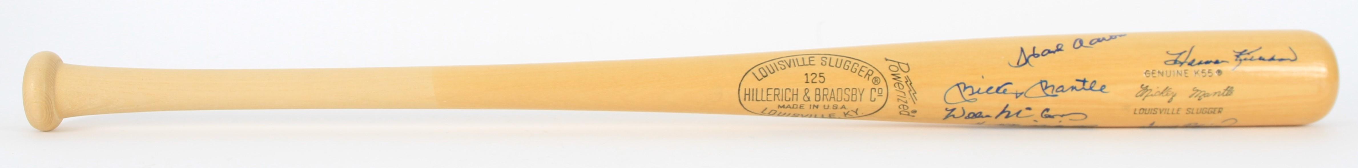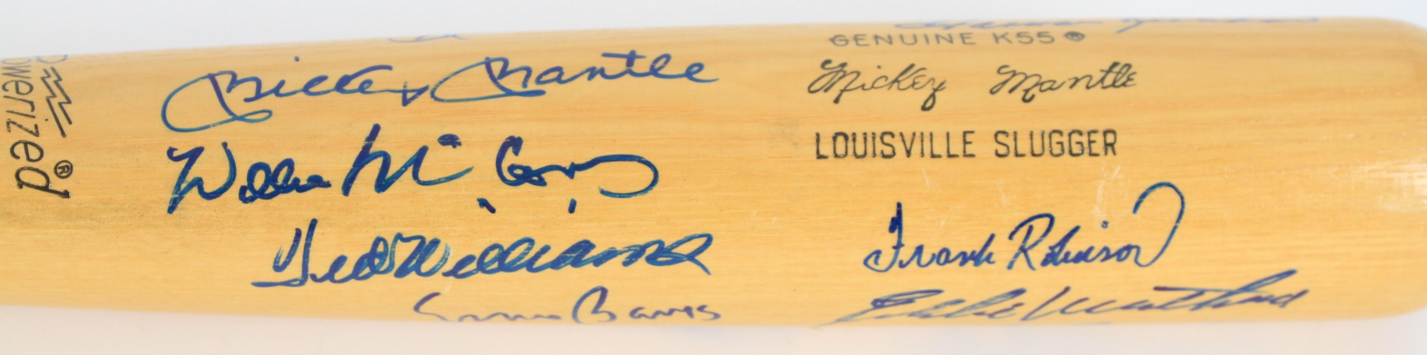 Louisville Slugger Mickey Mantle player model baseball bat has been hand-signed by (11) members of the 500 Home Run Club! Signers on the baseball bat include: