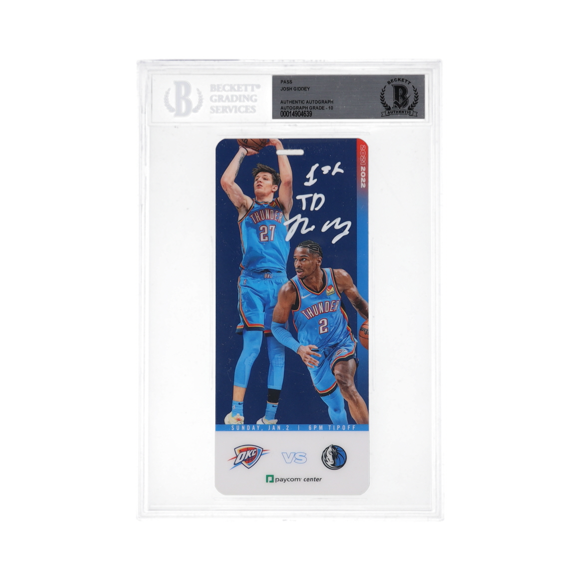 Ticket dated January 2, 2022 has been hand-signed and inscribed by Josh Giddey (Oklahoma City Thunder).