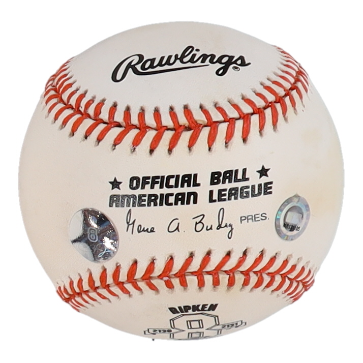 Rawlings Official American League Baltimore Orioles Logo commemorative baseball. Hand-signed by Cal Ripken Jr. (HOF). Please note, baseball is naturally toned.