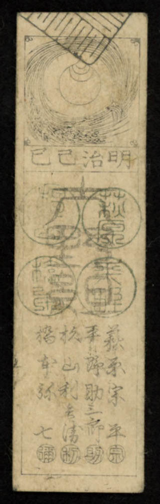 In 1871, the Government of Meiji Japan ordered the abolition of the han system and ordered the exchange of all scrip for the national currency. Exchange continued until 1879. In the interim, some scrip carried markings from the central government indicating the value in yen and the smaller sen and rin.