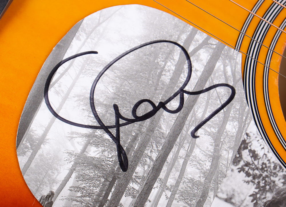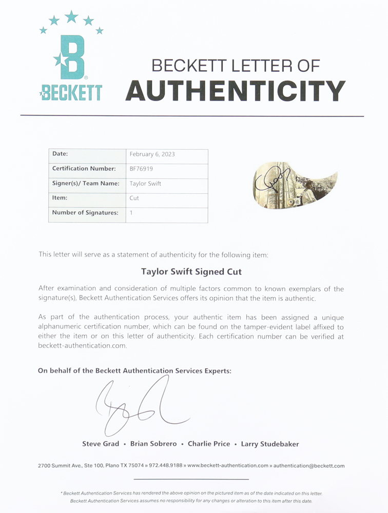 Acoustic guitar measures 39" in length and has been hand-signed on the pickguard by Taylor Swift.