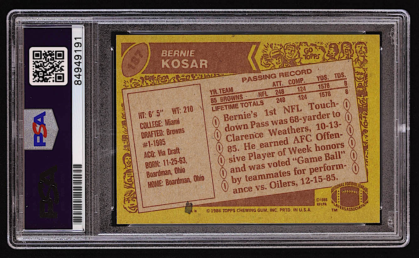Bernie Kosar Signed 1986 Topps #187 RC (PSA)