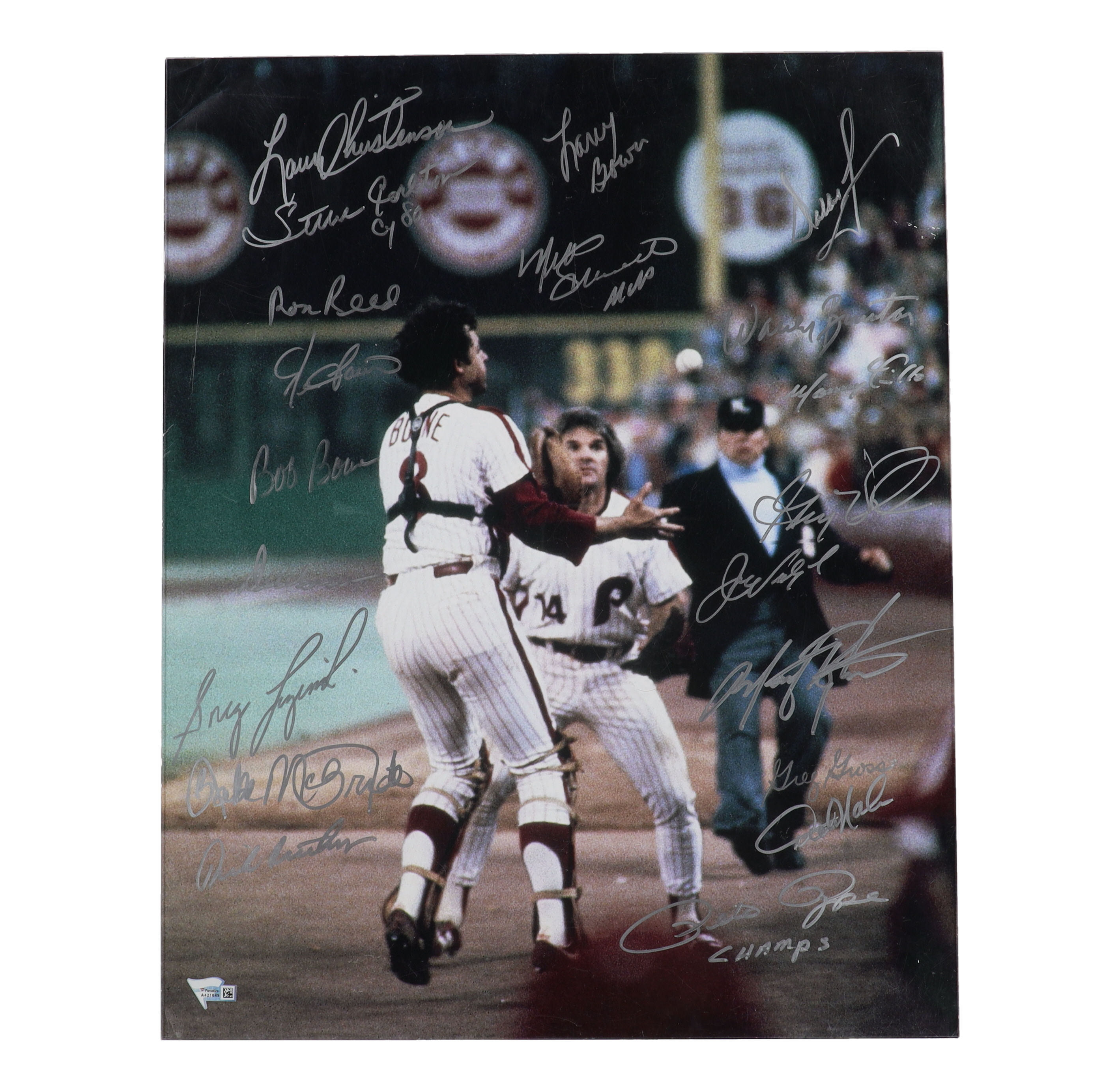 Photo measures 16" x 20" inches in size and has been hand-signed by Bob Boone, Larry Christenson, Garry Maddox, Kevin Saucier, Bobby Wine, Larry Bowa, Lee Elia, Bake McBride, Lonnie Smith, Mike Ryan, Warren Brusstar, Dallas Green, Dickie Noles, Del Unser, Mike Schmidt, Marty Bystrom, Greg Gross, Ron Reed, Ozzie Virgil, Greg Luzinski, Steve Carlton, Sparky Lyle, Pete Rose and George Vukovich.