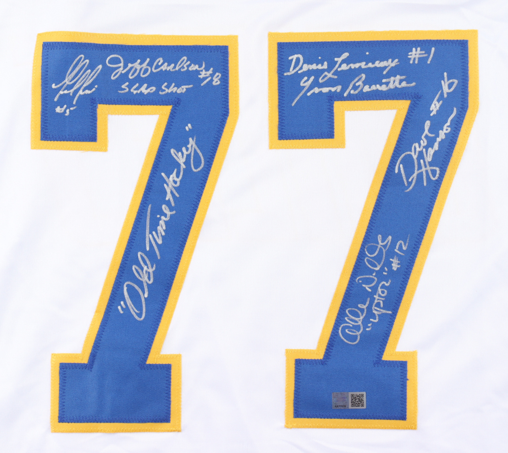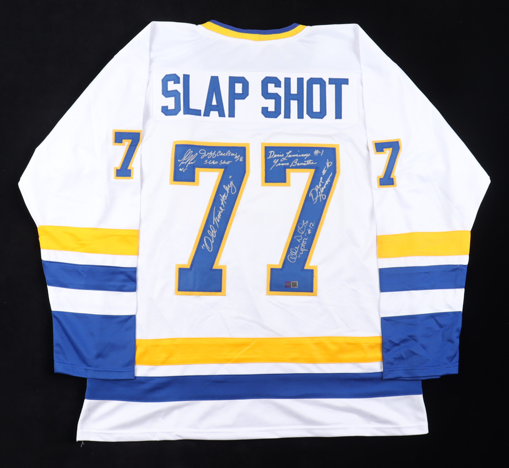 Custom jersey with everything sewn on, size XL. Hand-signed and inscribed by Dave Hanson (Jack Hanson), Allan F. Nicholls (Johnny Upton),Yvon Barrette (Denis Lemieux), Guido Tenesi (Billy Charlenois) and Jeff Carlson (Jeff Hanson).