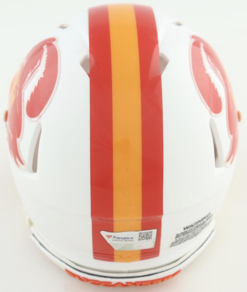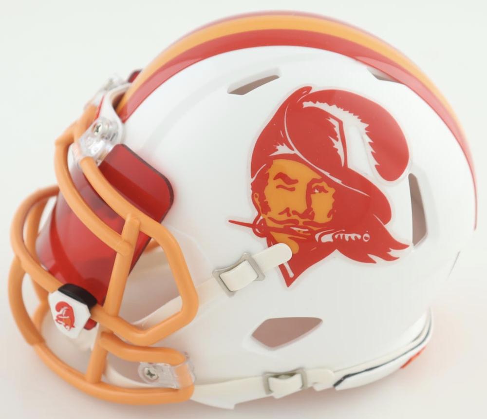 Riddell Tampa Bay Buccaneers Throwback Speed mini helmet has been hand-signed by Tom Brady. Included with this helmet is a custom visor and 3D bumpers and decals.