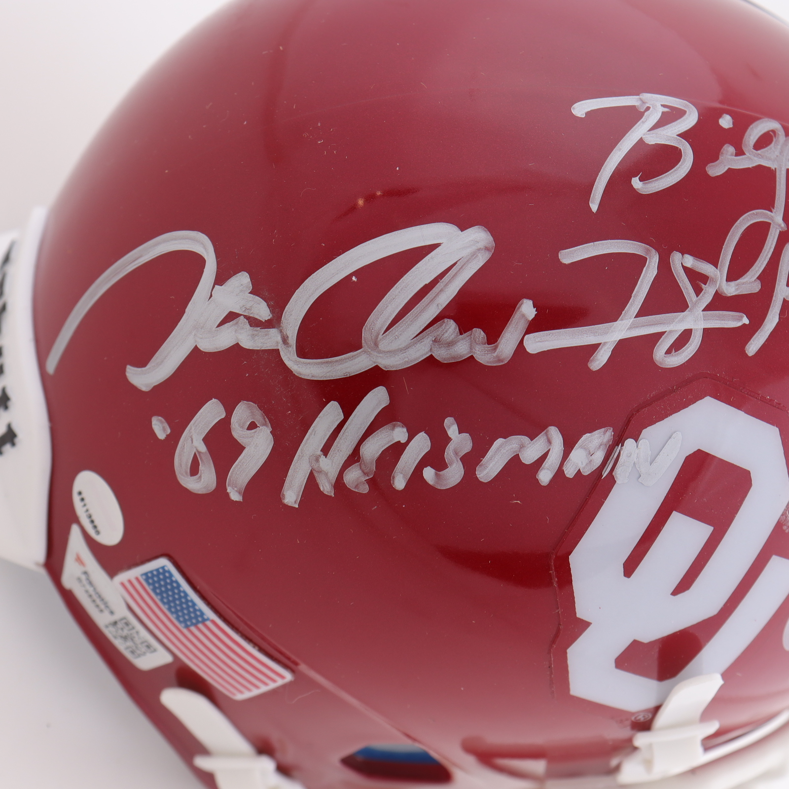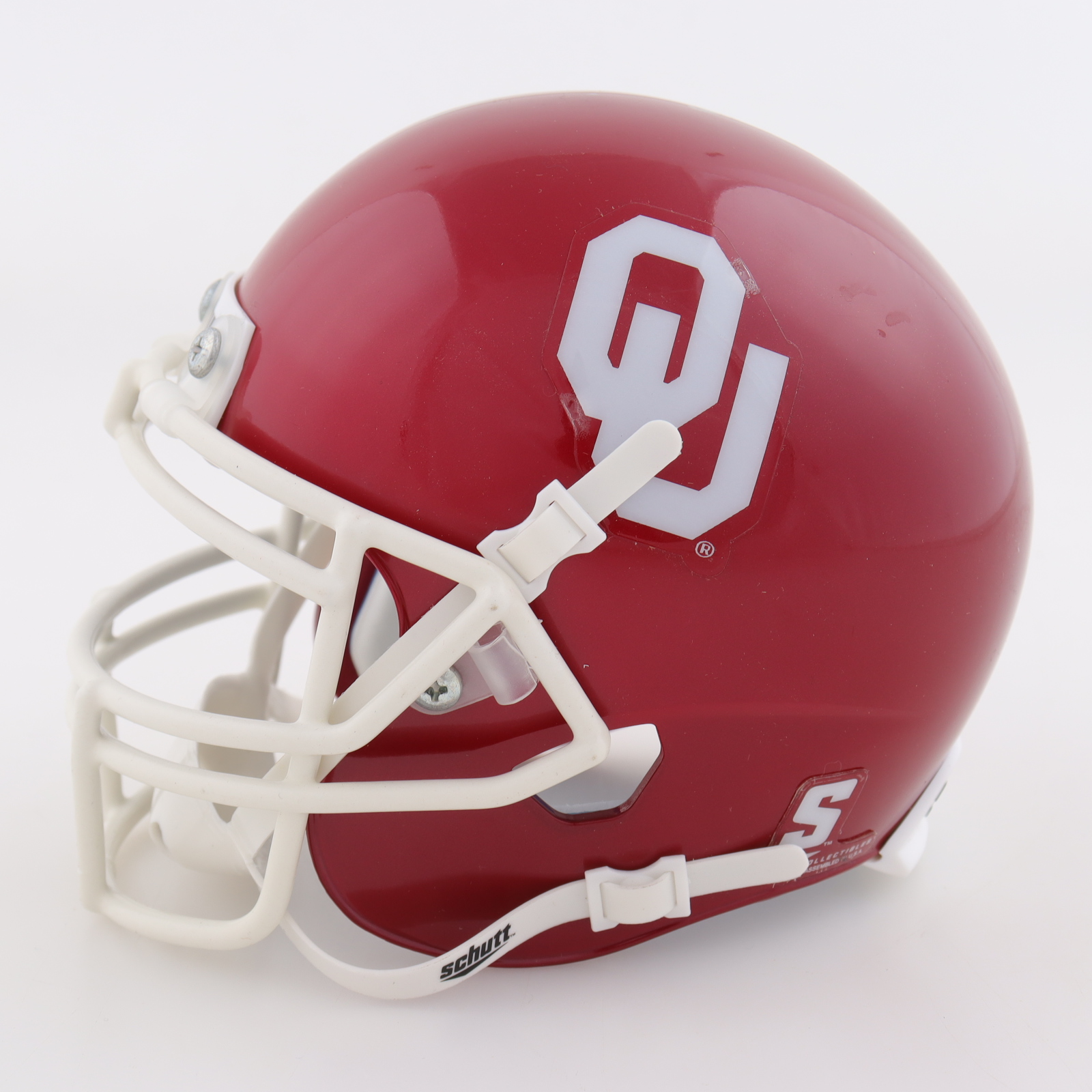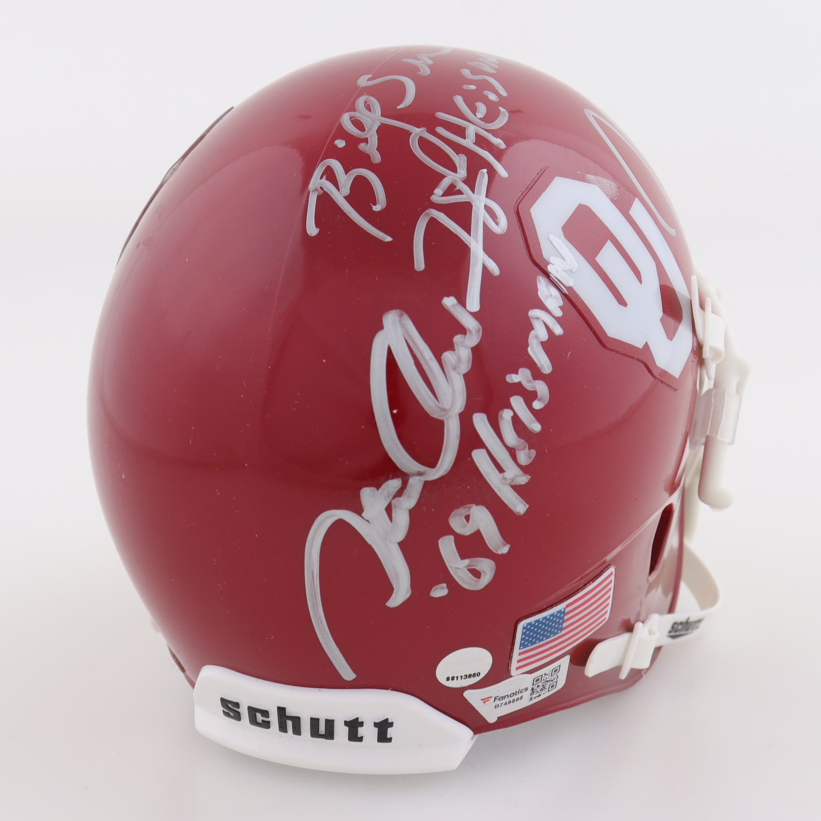 Schutt Oklahoma Sooners mini helmet. Hand-signed by Billy Sims, Steve Owens, and Jason White.